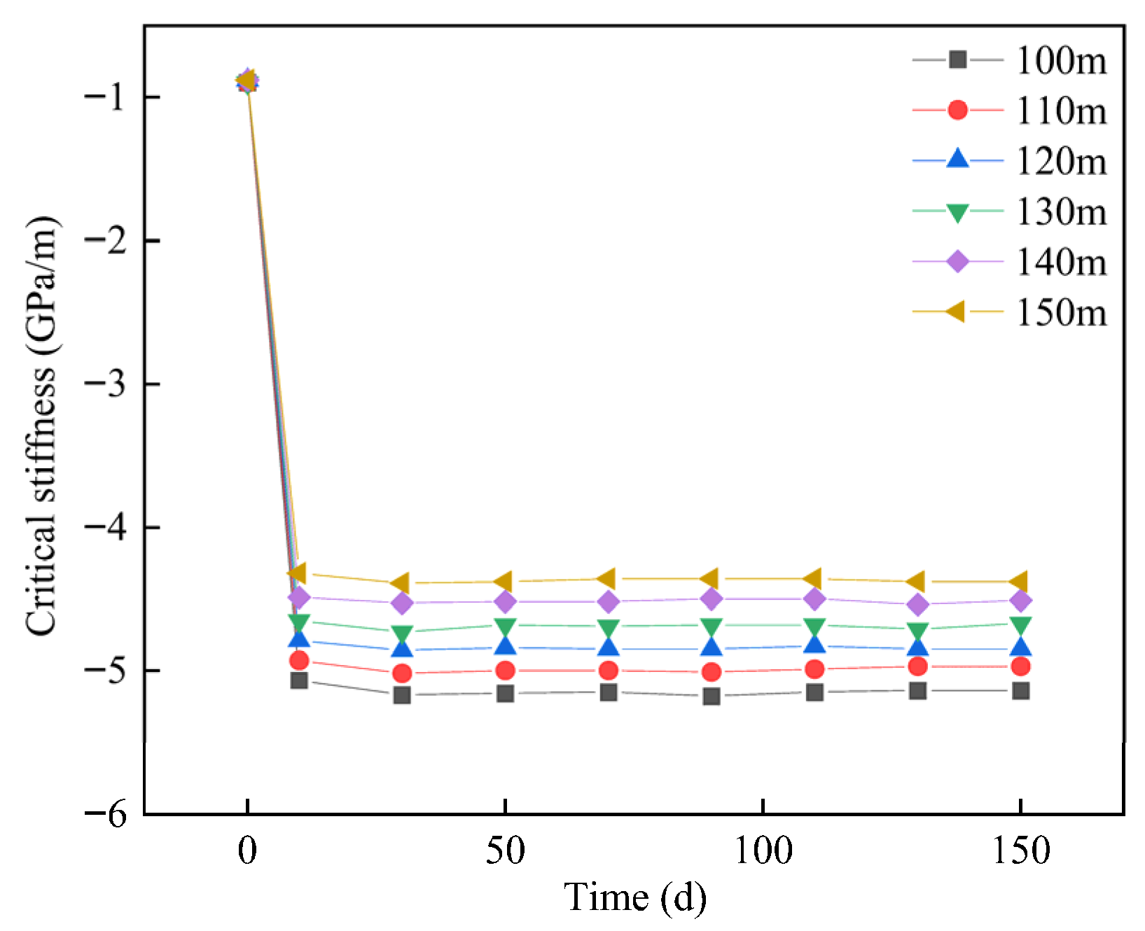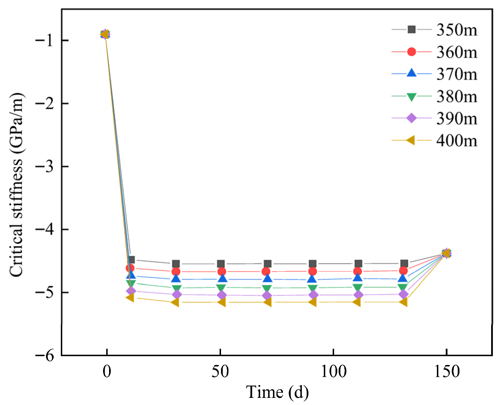 Figure 20. With increasing dip angle, critical stiffness declines more rapidly and reaches lower minimum values, indicating that steep-dipping faults respond more strongly to injection–production disturbances. However, their mechanical response exhibits a certain degree of delay. Overall, the results demonstrate that the larger the fault dip angle, the stronger the perturbation and stability impact induced by injection–production operations.