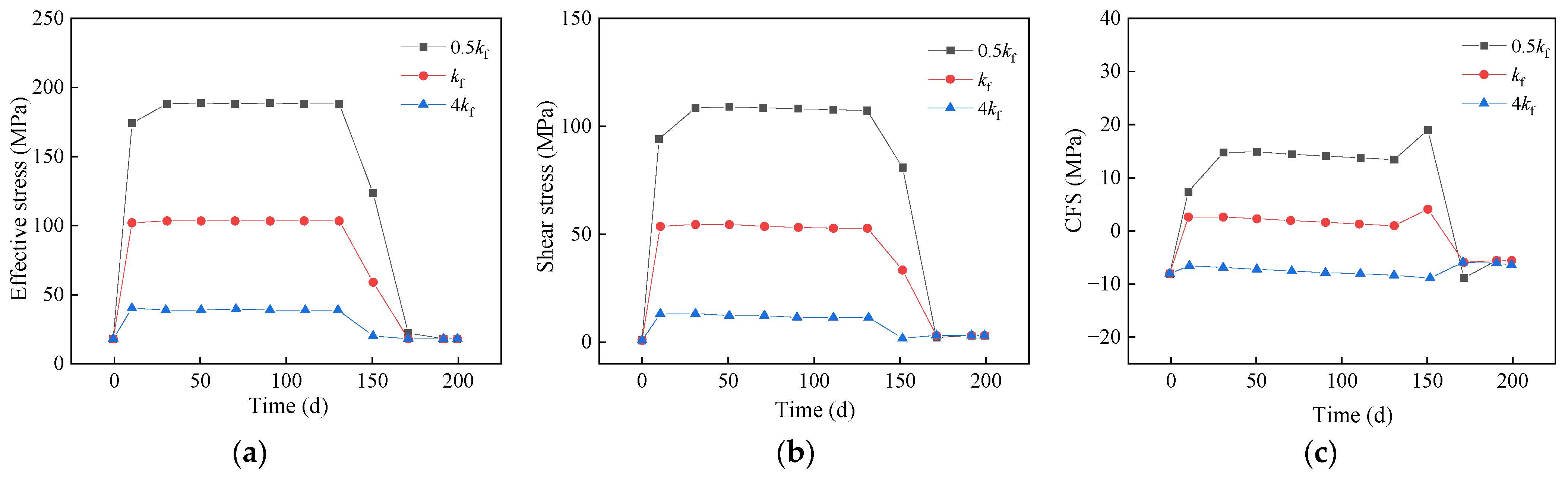 Temporal variations of (a) effective stress, (b) shear stress, and (c) CFS in the fault core under different permeabilities.