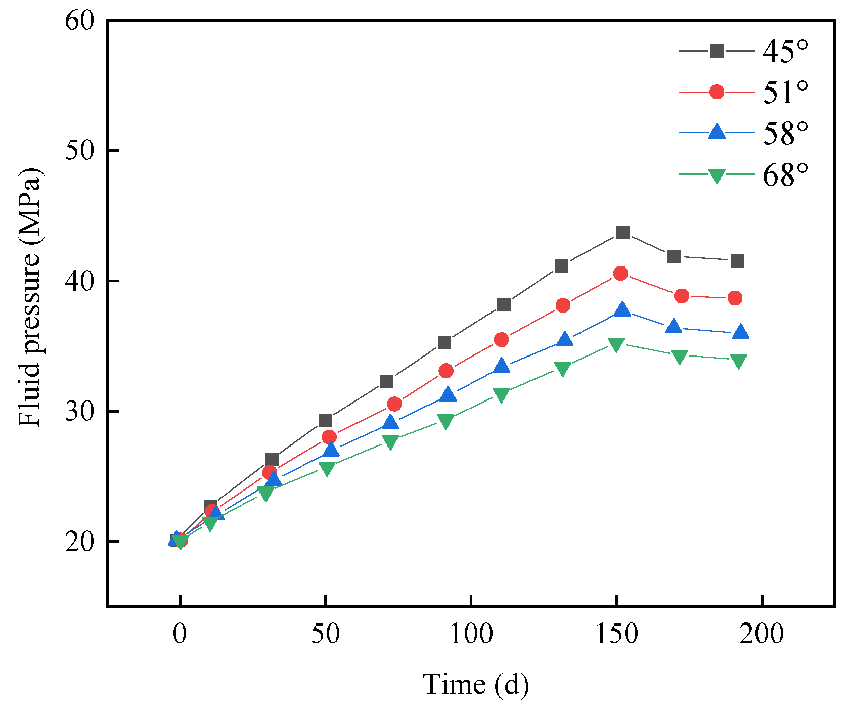 Temporal variation of pore pressure in the fault core under different fault dip angles.
