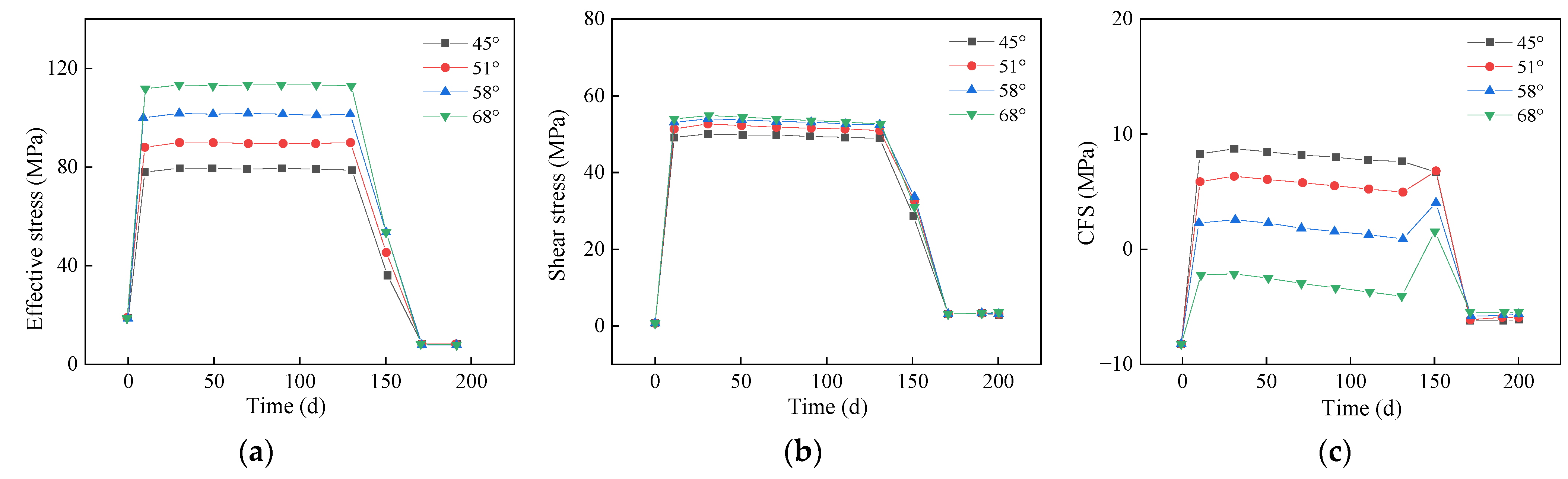 Temporal variations of (a) effective stress, (b) shear stress, and (c) CFS in the fault core under different fault dip angles.