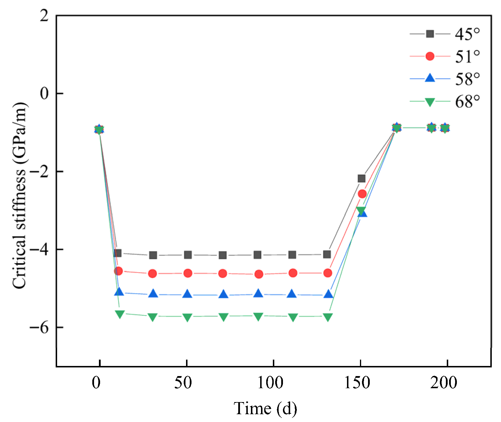 The evolution of critical stiffness under different dip angles is shown in