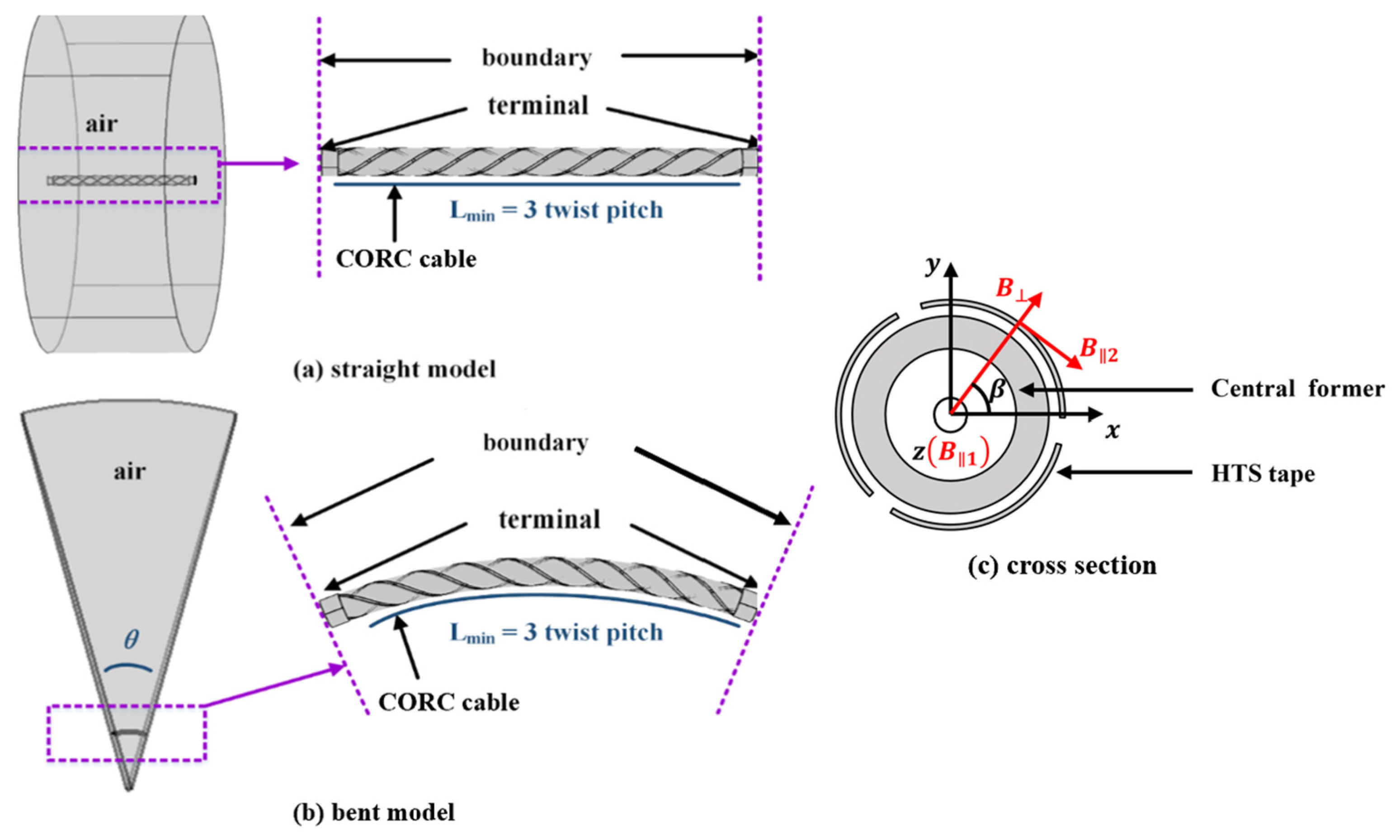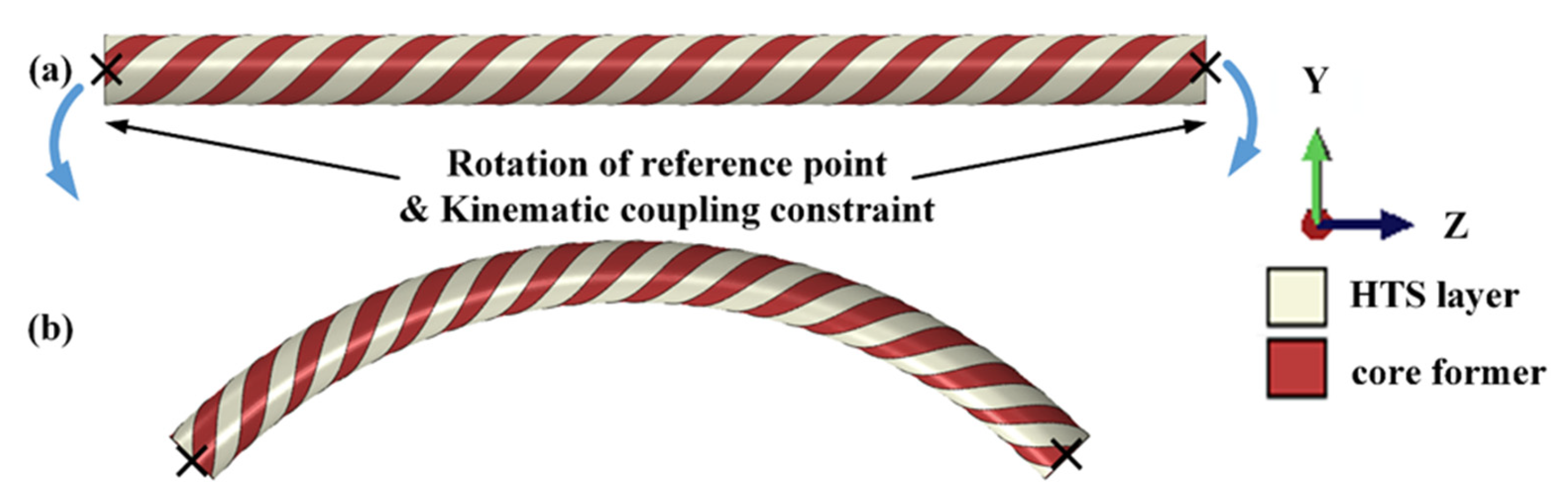 - Yan, J.; Wang, K.; Gao, Y. Numerical analysis of the mechanical and electrical properties of CORC cables under torsional loading. Cryogenics 2023, 129, 103624. [Google Scholar] [CrossRef]