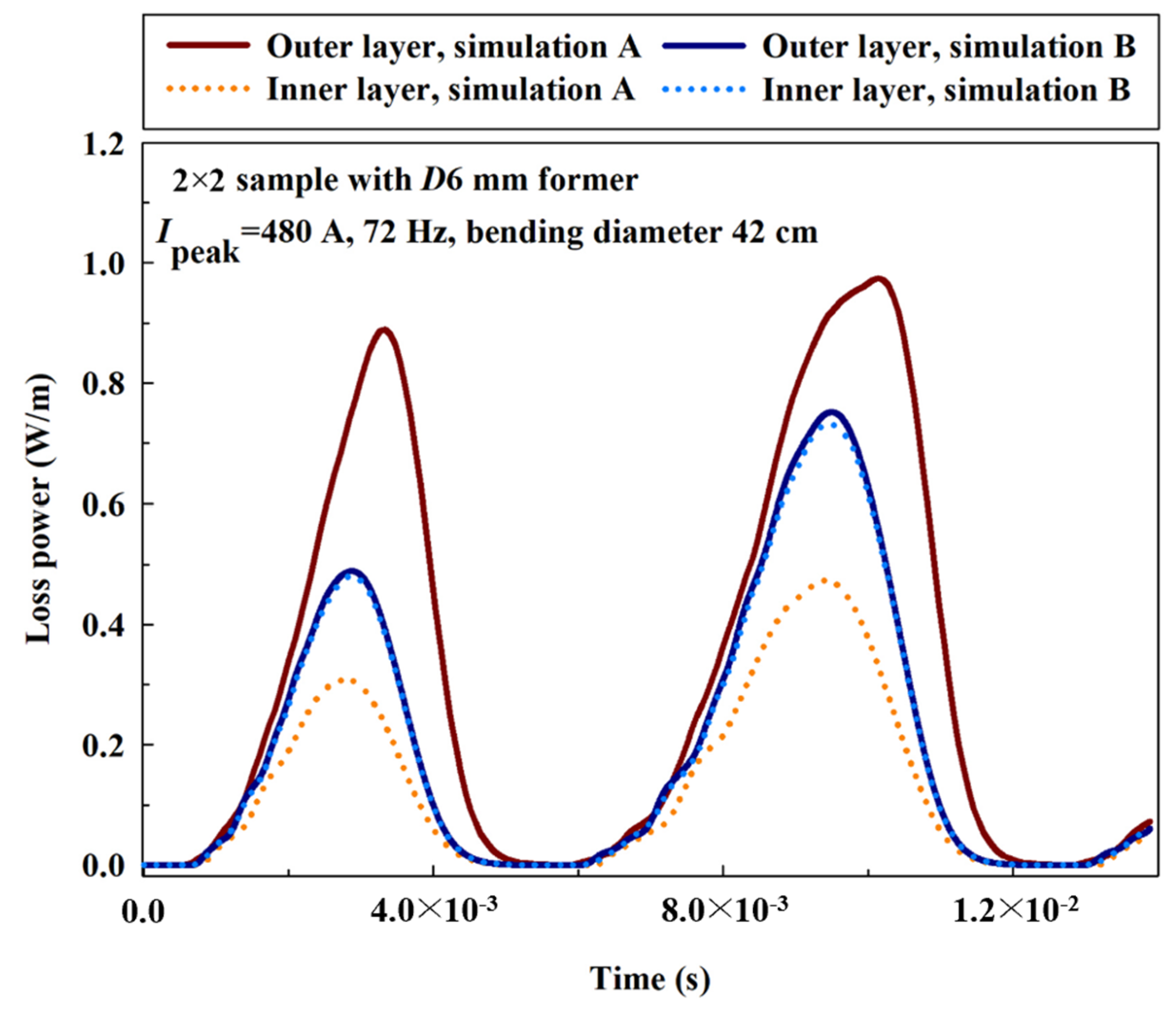- Yuan, W.; Coombs, T.A.; Kim, J.H.; Kim, C.H.; Kvitkovic, J.; Pamidi, S. Measurements and calculations of transport AC loss in second generation high temperature superconducting pancake coils. J. Appl. Phys. 2011, 110, 113906. [Google Scholar] [CrossRef]
