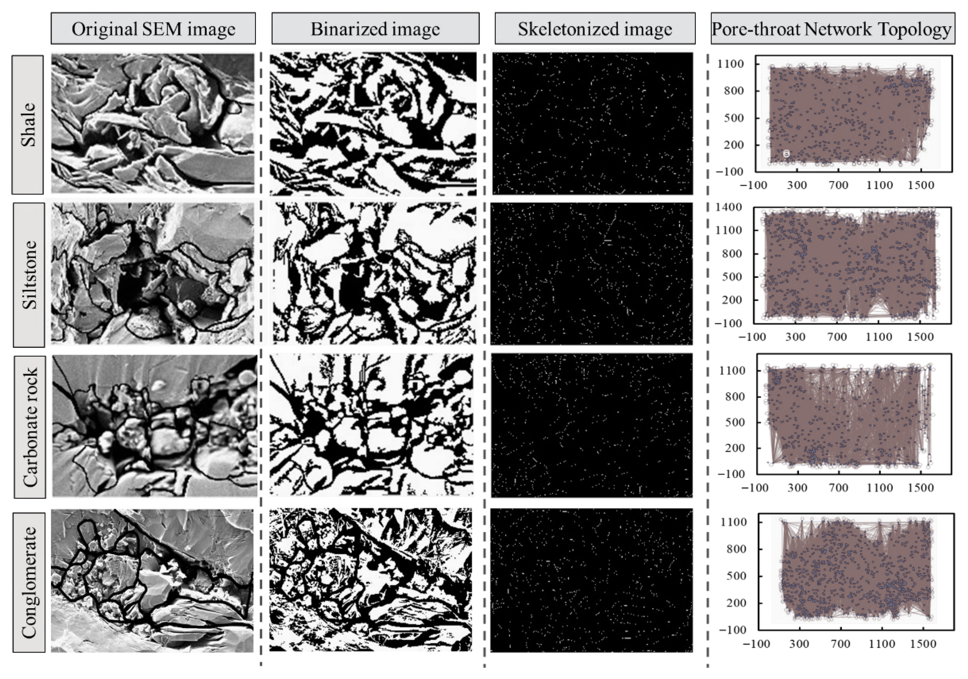 The microscopic image data used for pore–throat network modeling were mainly obtained from SEM images. All measurements were performed using an FEI Quanta 200F field-emission scanning electron microscope (FE-SEM) manufactured by FEI Company, Hillsboro, OR, USA, with an accelerating voltage typically set to 10–15 kV. Imaging was conducted primarily in backscattered electron mode to balance grayscale contrast at pore–mineral interfaces and image noise. For each lithologic sample, several representative areas were selected on the polished surface for area imaging. Macroscopic fractures, mineral-filled veins, and zones affected by polishing artifacts or contamination were deliberately avoided. For each lithology, multiple high-resolution SEM images that met the requirements for resolution and contrast were acquired. Part of this image set was used for qualitative identification of pore types and mineral assemblages. The remaining images, obtained under strictly uniform image quality criteria and parameter settings, were treated as quantitative fields of view for subsequent pore–throat network extraction. Each qualified SEM image contains 1348 × 1768 pixels, corresponding to a spatial resolution of approximately 0.04–0.08 μm/pixel. Across all lithologic fields of view, the identified total numbers of pores and throats reach the order of several thousands to tens of thousands, ensuring the representativeness and robustness of the statistical analysis of pore–throat structures.