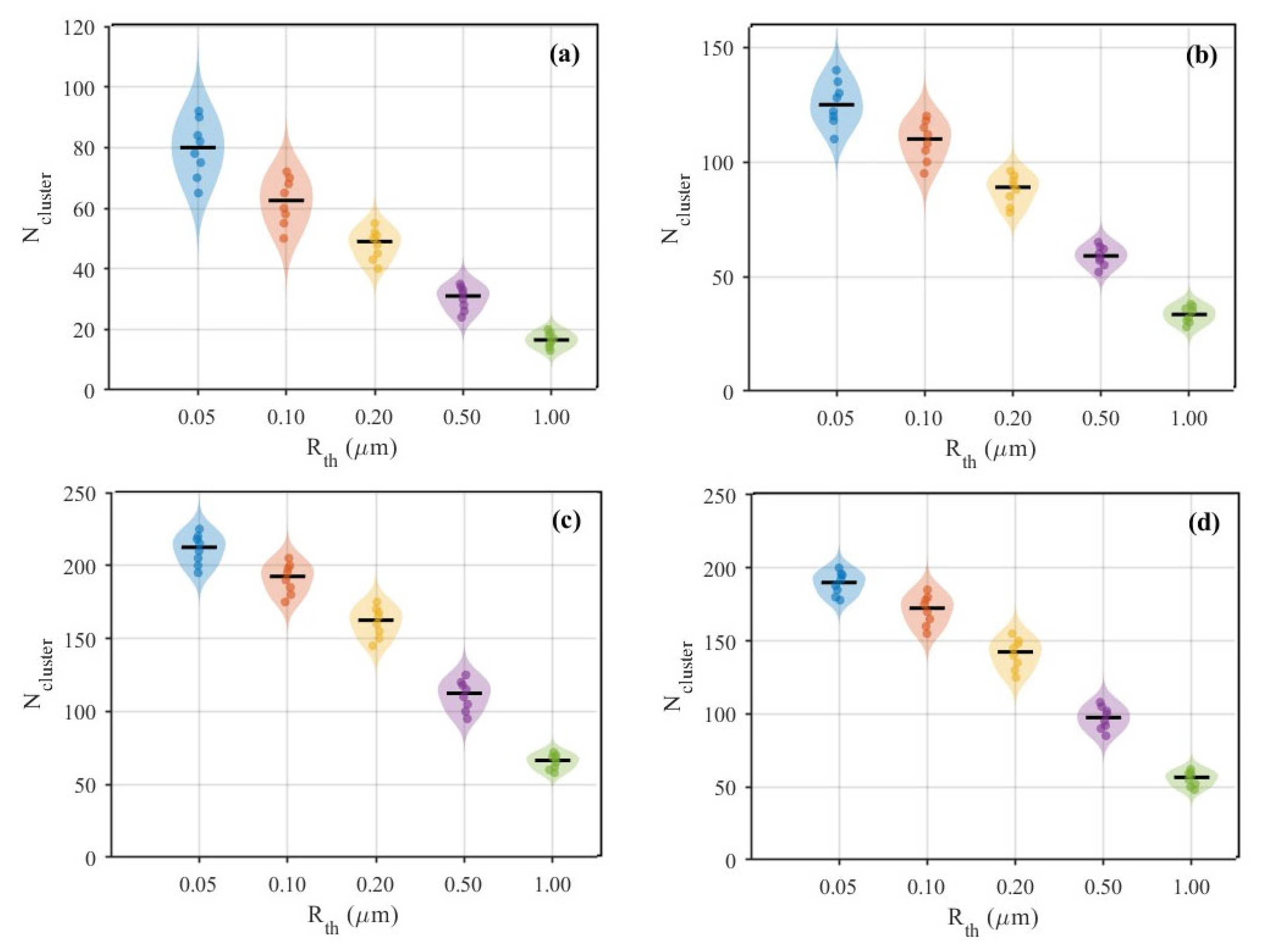 “Effective seepage channels” refers to the subset of accessible and connected pore–throat elements that contribute to connected pathways under a given Rth. To characterize network properties under different effective seepage channels sizes, a throat radius threshold (Rth) is introduced. For a given Rth, only throats with Rt ≥ Rth are retained. This yields an effective pore–throat network at that threshold. Within this network, connected clusters that span the field of view are identified by connected component searching. The total number of throats included in these spanning clusters is defined as the number of effective seepage channels (Nchannel). The number of pores within the largest connected cluster is defined as the maximum connected cluster size (Ncluster).