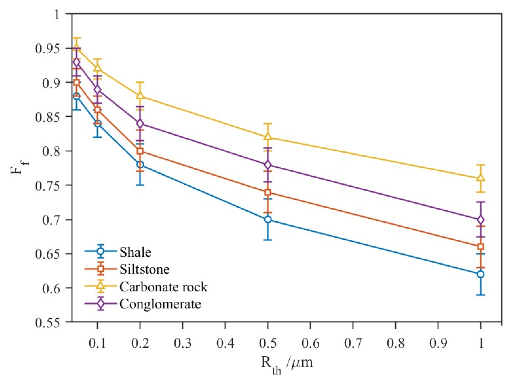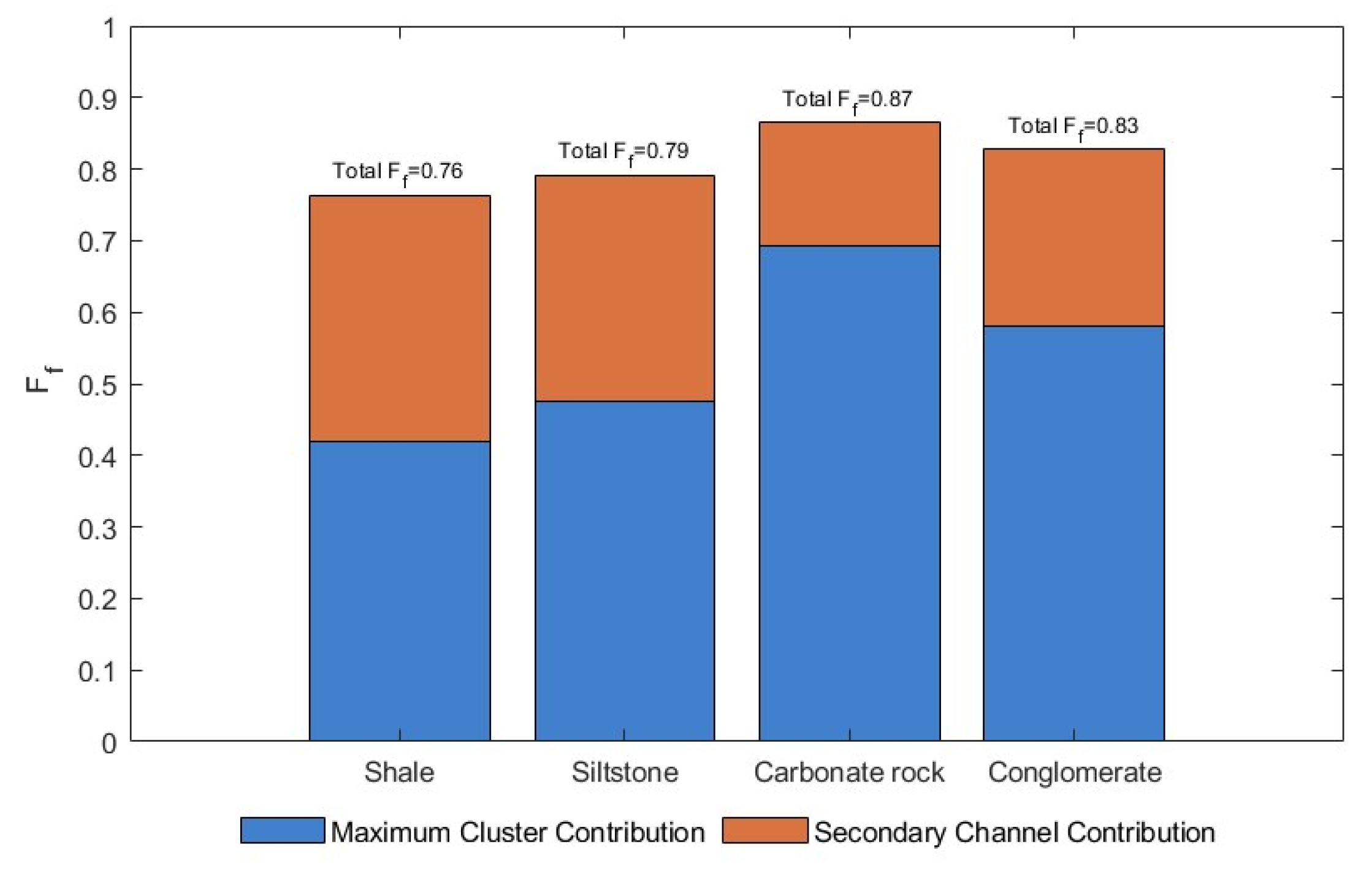 Therefore, the homogeneity of seepage channels has a stronger controlling effect on the fluid flow capacity of shale and siltstone. This is because seepage channels in these lithologies are generally composed of thin throats, and local geometric bottlenecks significantly limit the depth of displacement facies advancement and flow rate. In contrast, in carbonate rocks and conglomerates, the throat scale within seepage channels is generally larger and relatively concentrated. The influence of local geometric heterogeneity on Ff is weakened. Additionally, the controlling effect of seepage channel homogeneity on fluid flow capacity is relatively weak.