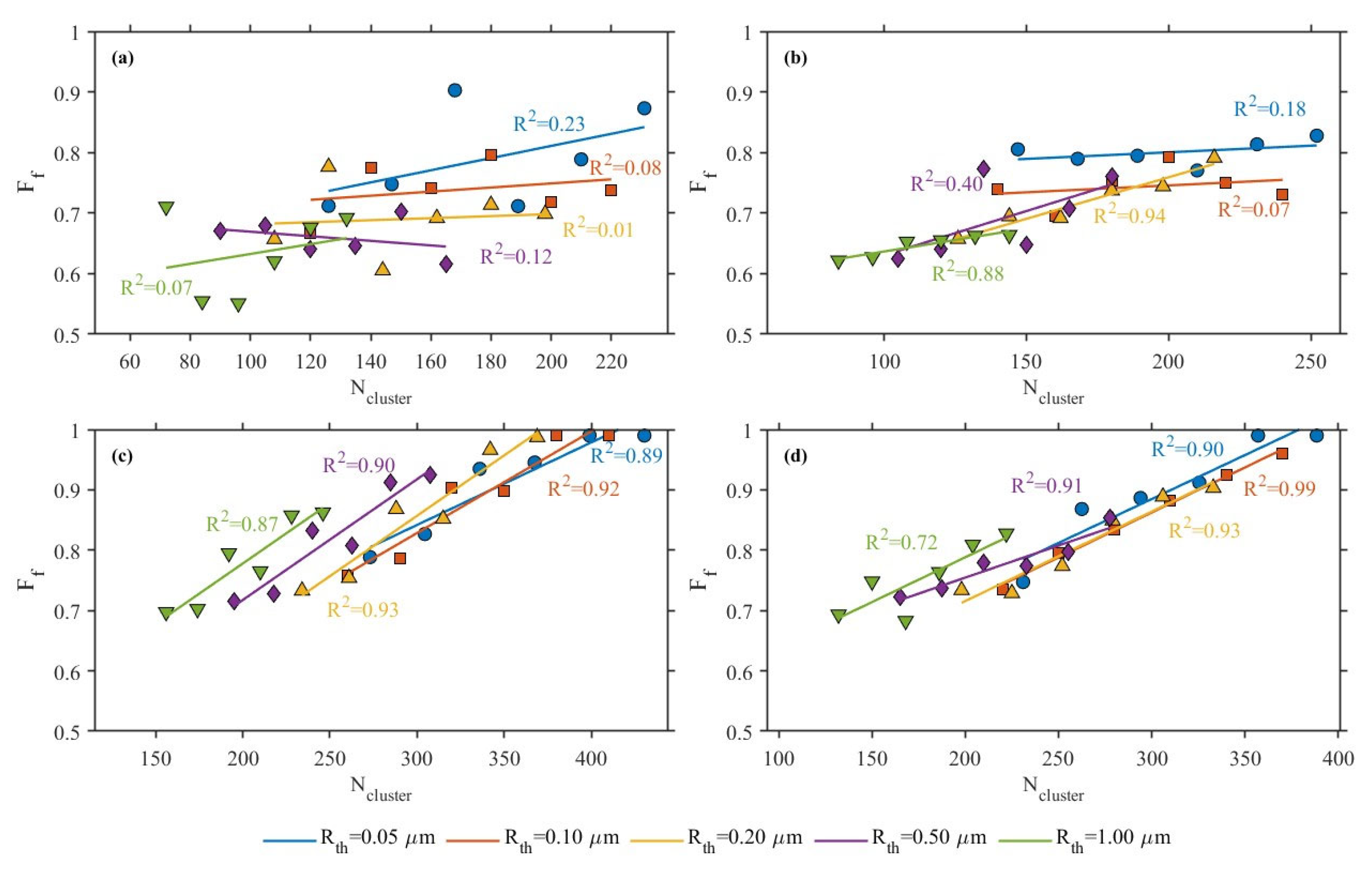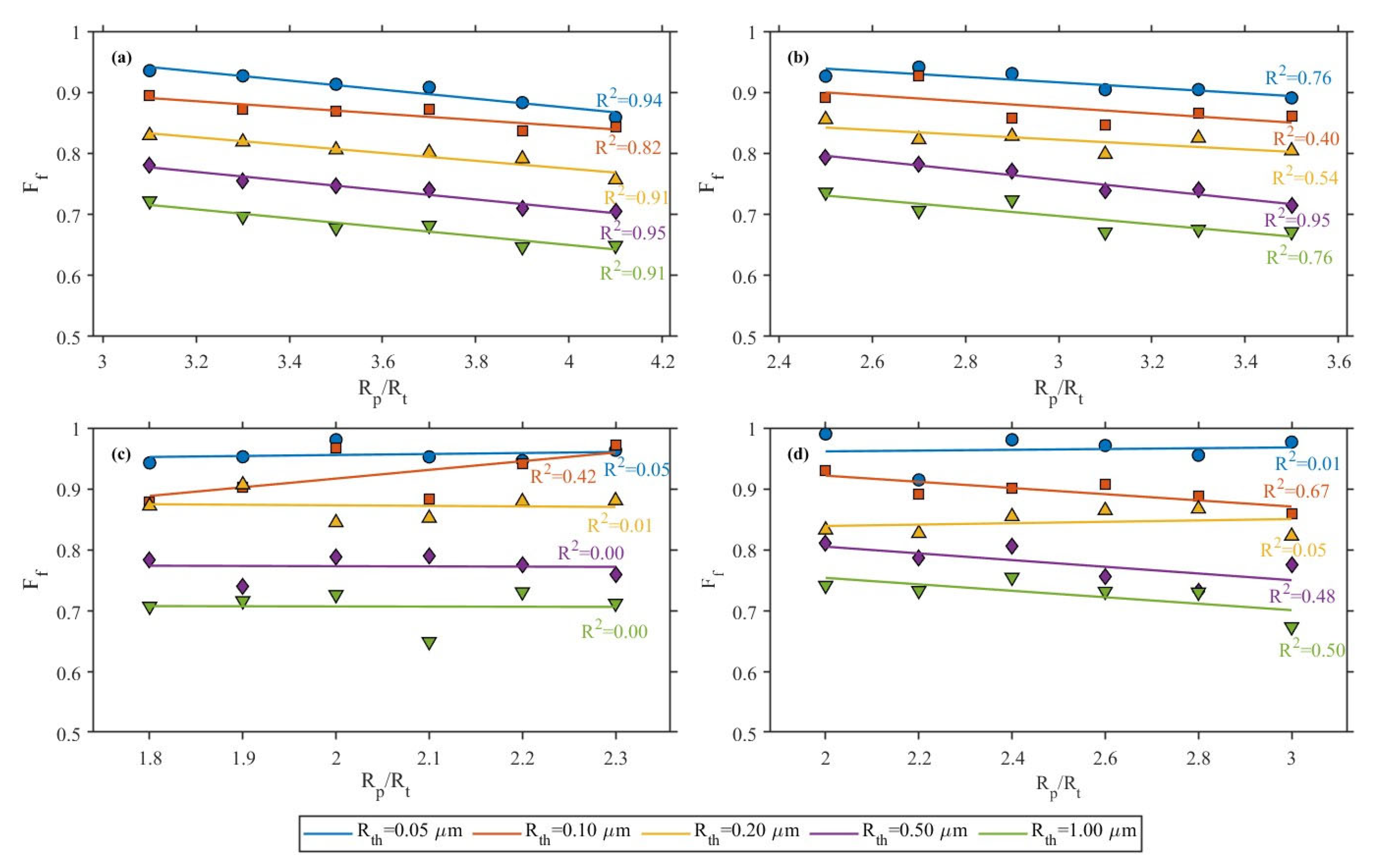 2 for linear fitting under most threshold conditions can reach 0.82–0.95 for shale and approximately 0.40–0.95 for siltstone. This indicates that in tight reservoirs dominated by thin throats, the degree of pore–throat scale matching within the permeation channels has a strong controlling effect on the volume fraction of connectable pores. The larger the R