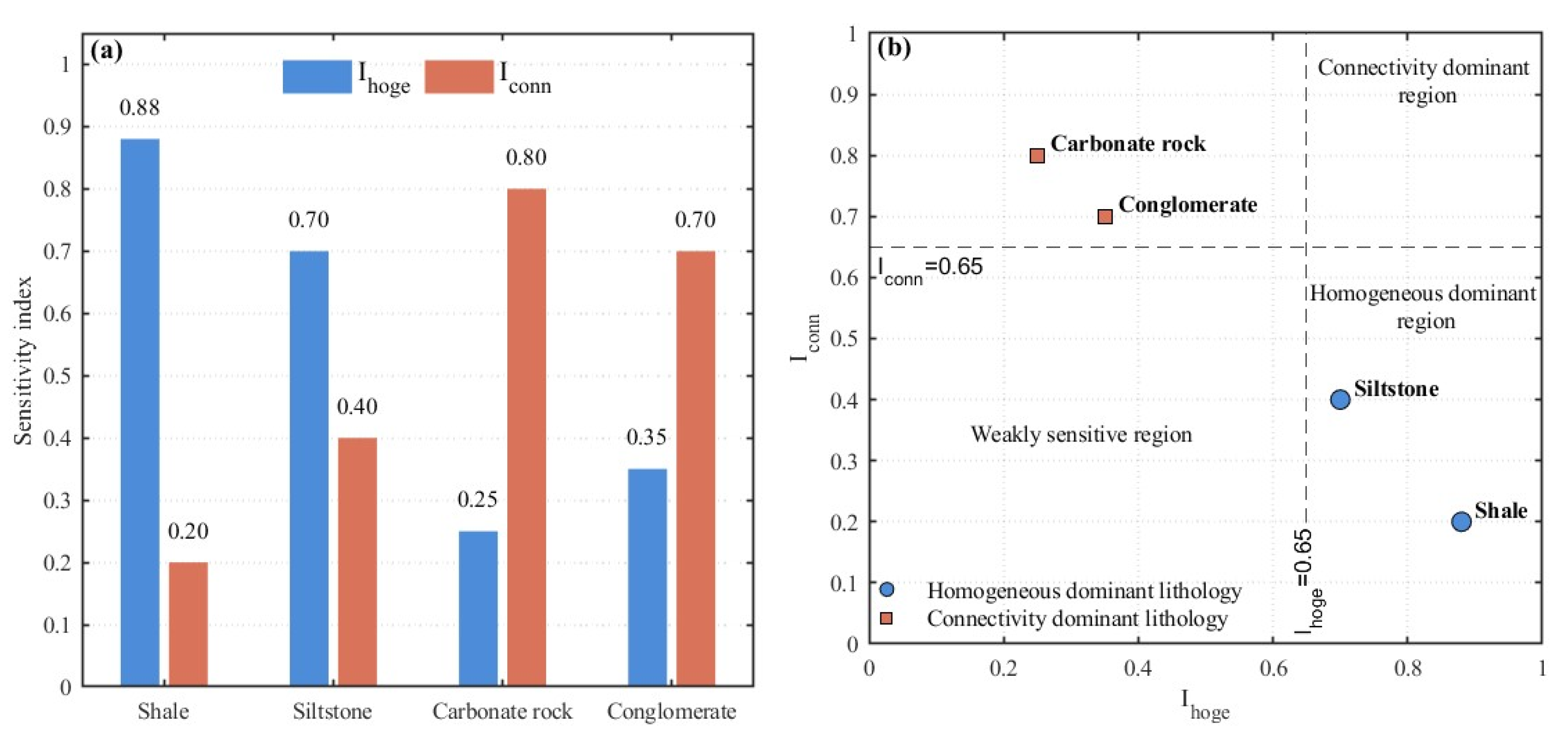 To more intuitively identify the dominant structural types of tight reservoirs with different lithologies, the planar structure was divided into a homogeneous-dominant control region and connectivity-dominant control region using empirical thresholds of Ihoge = 0.65 and Iconn = 0.65. Areas below these thresholds were classified as weakly sensitive regions. Shale and siltstone, located in the quadrants of Ihoge > 0.65 and Iconn < 0.65, were classified as homogeneous-dominant control lithologies for seepage channels. Carbonate rocks and mixed sedimentary rocks, falling within the quadrants of Iconn > 0.65 and Ihoge < 0.65, belonged to the pore–throat network connectivity-dominant control lithology. None of the four lithologies studied fell into the weakly sensitive region, indicating that at least one structural feature, whether homogeneous or connectivity-based, significantly controls fluid flow capacity.