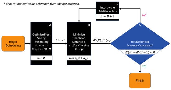 Figure 1 illustrates the EB scheduling optimization process, which begins by determining the minimal number of EBs required to complete the given timetables under the assumption of abundant battery capacity (Block A). Once the minimal fleet size is determined through MILP optimization, the next step focuses on optimizing trip assignment and charging schedules, where each timetable trip is allocated to an EB, aiming to minimize deadhead distance and charging cost (Block B). The deadhead distance is defined as the total distance traveled by empty EBs as they move between different routes to either start their next service trip or recharge at designated charging stations. To explore a trade-off between fleet size and deadhead distance (and also charging cost), the scheduling optimizations are conducted for a range of EB fleet sizes, starting from the minimum number and being incrementally increased (Block D) until the deadhead distance saturates (Block C).