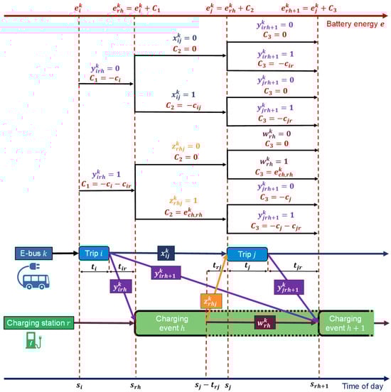 An energy level of individual EBs evolves through two processes: energy decrease due to consumption during trips and deadhead travel, and energy gain due to charging. Conceptually, the binary variables select the next action of each EB (drive to the next trip or charge), while the continuous energy variables track the battery state along the selected sequence. Feasibility is then guaranteed by time-sequencing constraints, charging station capacity limits, and battery bounds, together with the end-of-day charge sustaining condition. As illustrated in Figure 2, the battery state of th EB is updated depending on whether it (i) completes trip and travels from the end of trip to the start of trip (), (ii) completes trip and proceeds to charging event at charging station (), (iii) charges during charging event at charging station and then departs to the start of trip (), or (iv) charges at event and continues charging during the subsequent charging event at the same station (). At each discrete step, only one of these transition variables can be active, reflecting a single action taken by the EB. The corresponding energy variables and are constrained to remain within the battery limits (3), and the overall schedule must satisfy the charge sustaining condition (5), ensuring repeatable day-to-day operation. The change in the EB energy level is covered by the following (unified) battery state equation: