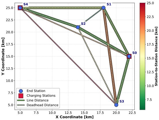 Finally, the travel time and the respective traveling distance and energy consumption are introduced to denote deadhead traveling between a service trip to a charging station (), a charging station to a service trip (), and between two consecutive service trips, and (). Note that deadhead time, distance, and energy consumption can be zero when the end station of a trip coincides with the departure station of the next trip () or when a charging station is located at the trip’s end station.