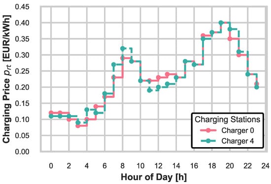 Each charging station is associated with a set of charging events , where each event represents a one-hour time window. Charging sessions must be fully contained within a single event (i.e., within one hour), but the start time and duration are arbitrary within that window (and can be extended to the subsequent window through a new event). This enables flexible charging durations while ensuring that the full session is billed at a single, well-defined price . For each event , the applicable charging price is defined as: