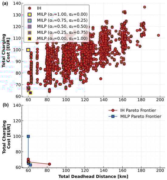 The main aim is to provide Pareto optimal solutions in terms of total number of EBs, deadhead distance, and charging costs. In the first step, the optimization focuses on minimizing the number of EBs in accordance with objective function (12), which is needed to cover all trips (Block A in Figure 1; Section 2). To explore the trade-off between the deadhead distance and charging cost, objectives (13) and (14) are combined into a weighted normalized objective function: