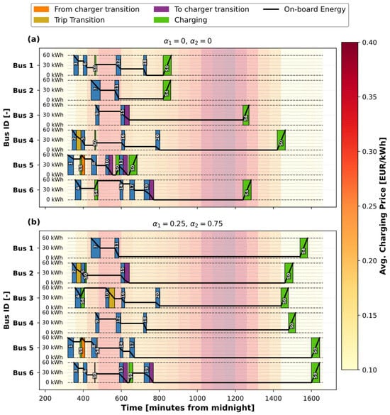 where is the start time of the last scheduled trip of the previous day. While a finer discretization (e.g., 15 min intervals) could provide higher temporal resolution, the hourly discretization is chosen to align charging decisions with hourly electricity price signals and to limit computational complexity. Importantly, this does not enforce EBs to exclusively charge for a full hour or wait for the next hourly slot, since the charging amount within each interval is optimized as a continuous decision variable and can take on any value between 0 and 1 h (see the charging management results in Section 4.2). To assess the impact of this modeling approach, a finer time discretization is examined in Section 4.