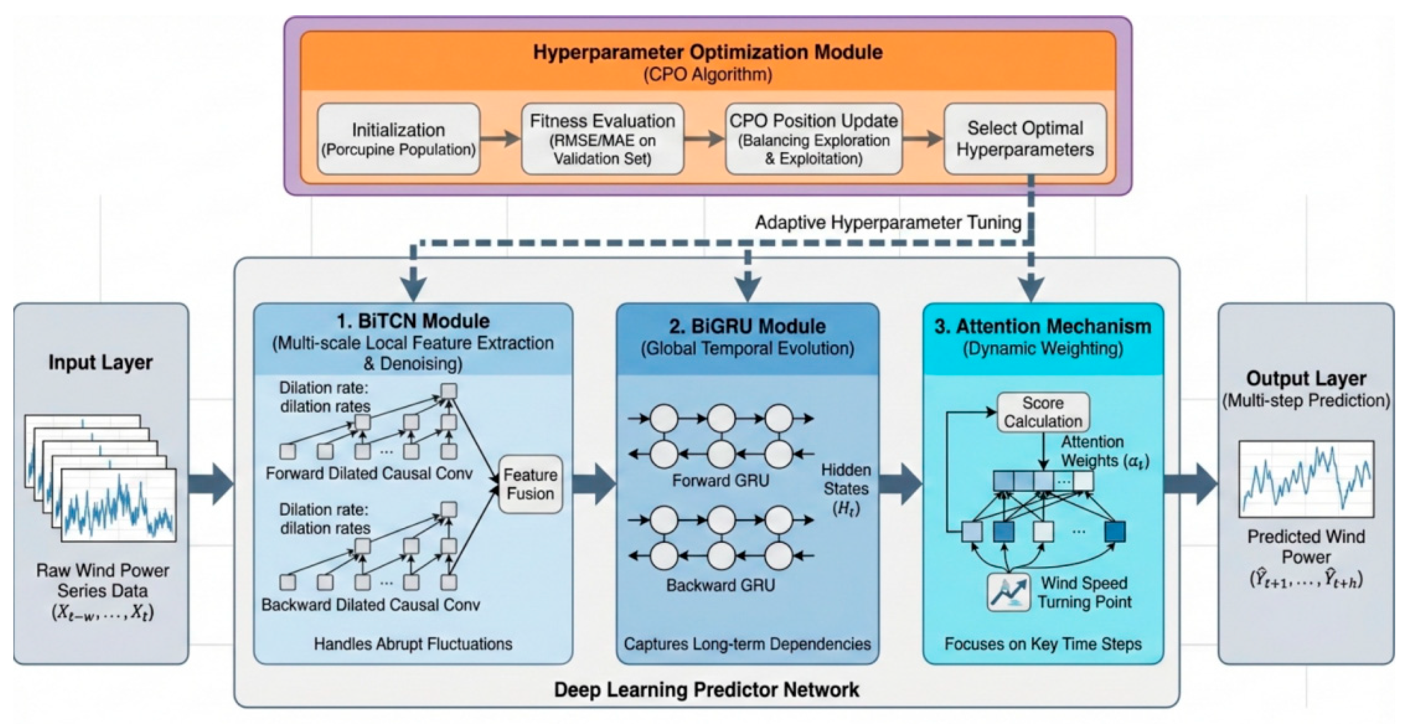 To bridge these gaps, this paper proposes a CPO-BiTCN-BiGRU-Attention framework. We theoretically justify this combination: BiTCN acts as a “feature filter” to extract local patterns and reduce noise; BiGRU models the global sequence; and Attention highlights physically significant moments. Crucially, we employ the Crowned Porcupine Optimization (CPO) algorithm. Unlike PSO [