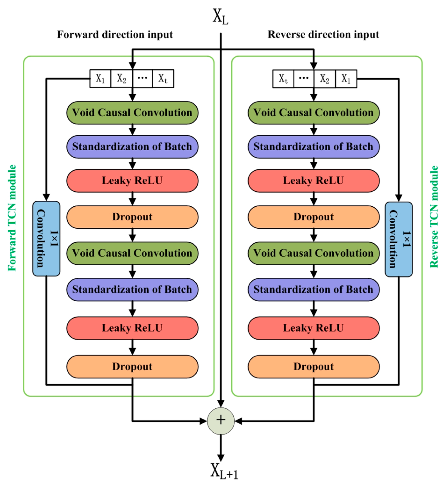 Figure 2. Each sub-network is composed of stacked layers including a 1 × 1 convolution, dilated causal convolution, batch normalization, Leaky ReLU activation, and dropout regularization. The outputs of the forward and backward TCNs are subsequently fused to form a bidirectional temporal representation.
