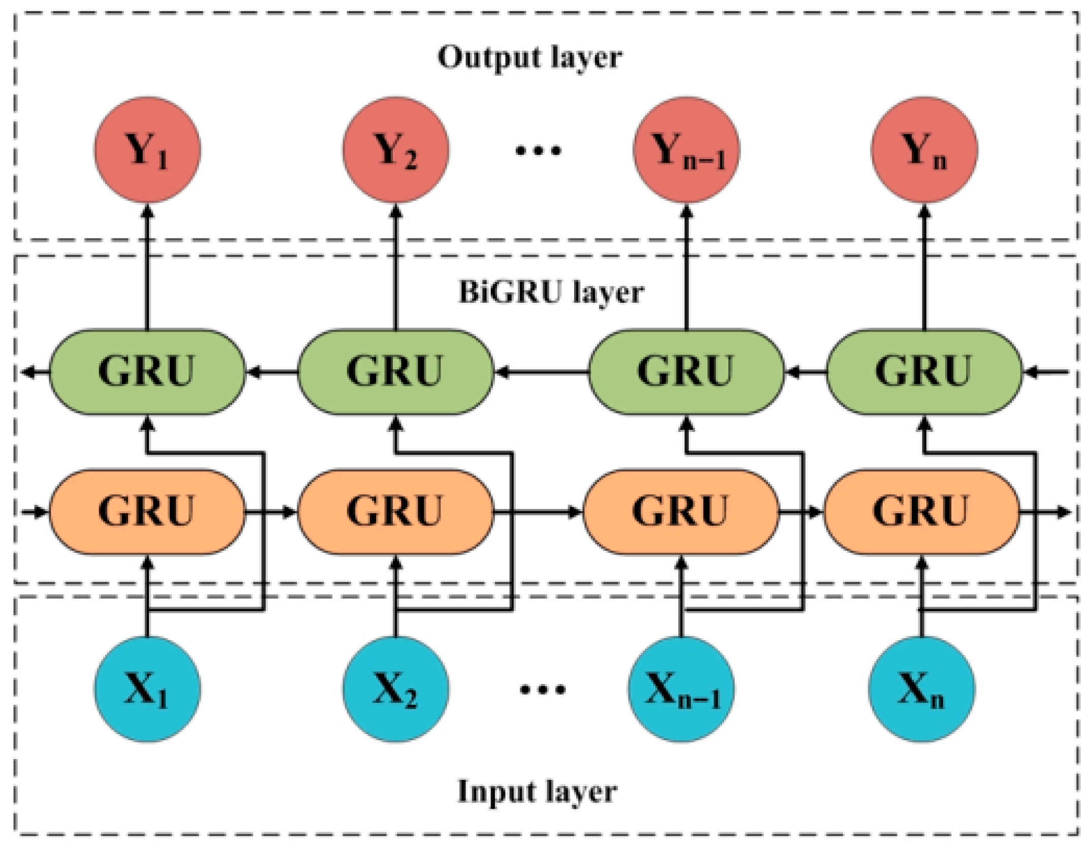 The BiGRU consists of two parallel GRU layers: a forward GRU layer, which processes the input feature sequence in chronological order, and a backward GRU layer, which processes the same sequence in reverse order, as illustrated in