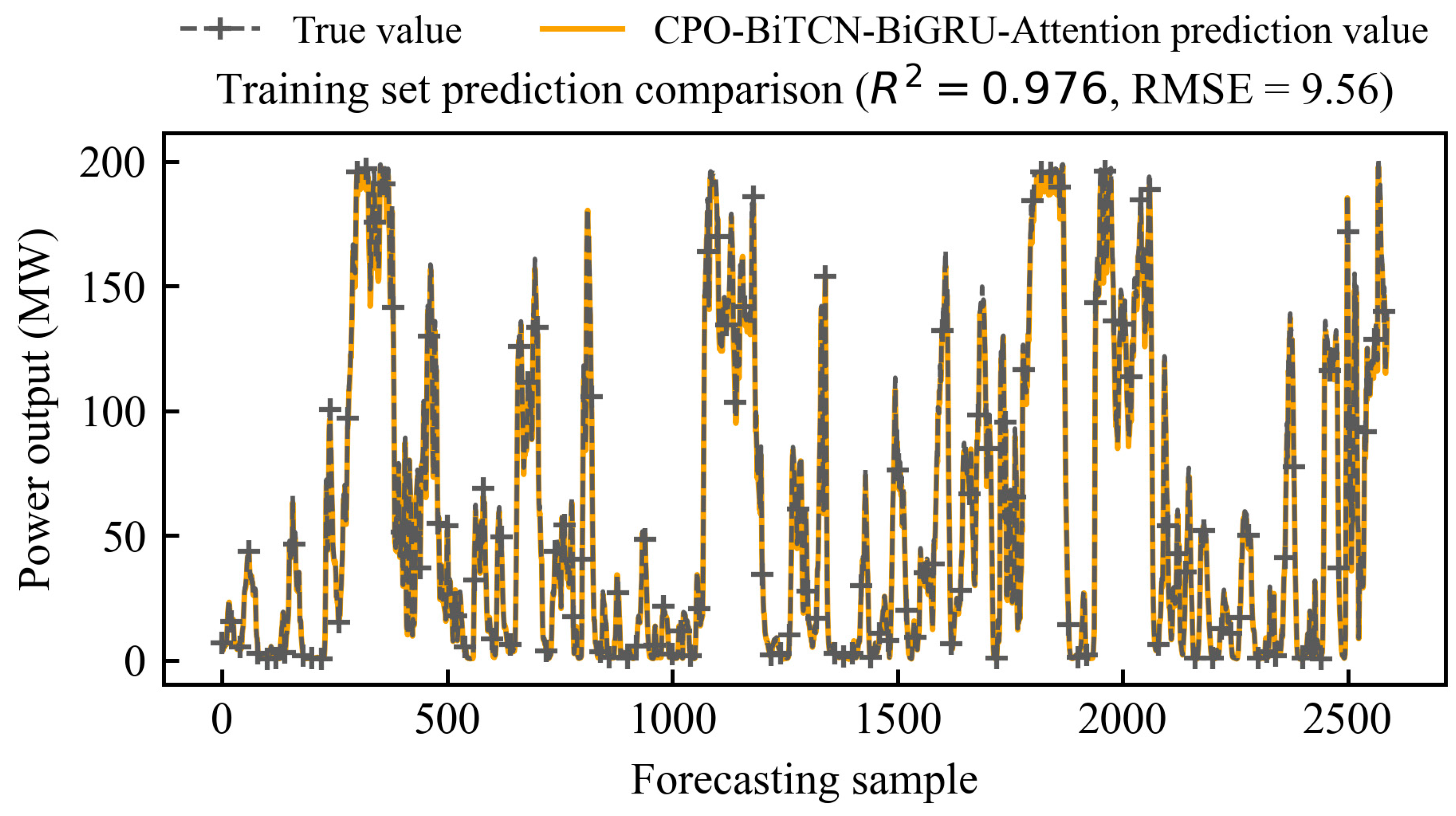 Table 6, the CPO-BiTCN-BiGRU-Attention model exhibited significant performance advantages over all classic models. These results further confirm the advancement and efficiency of the CPO-BiTCN-BiGRU-Attention model in short-term wind power prediction.