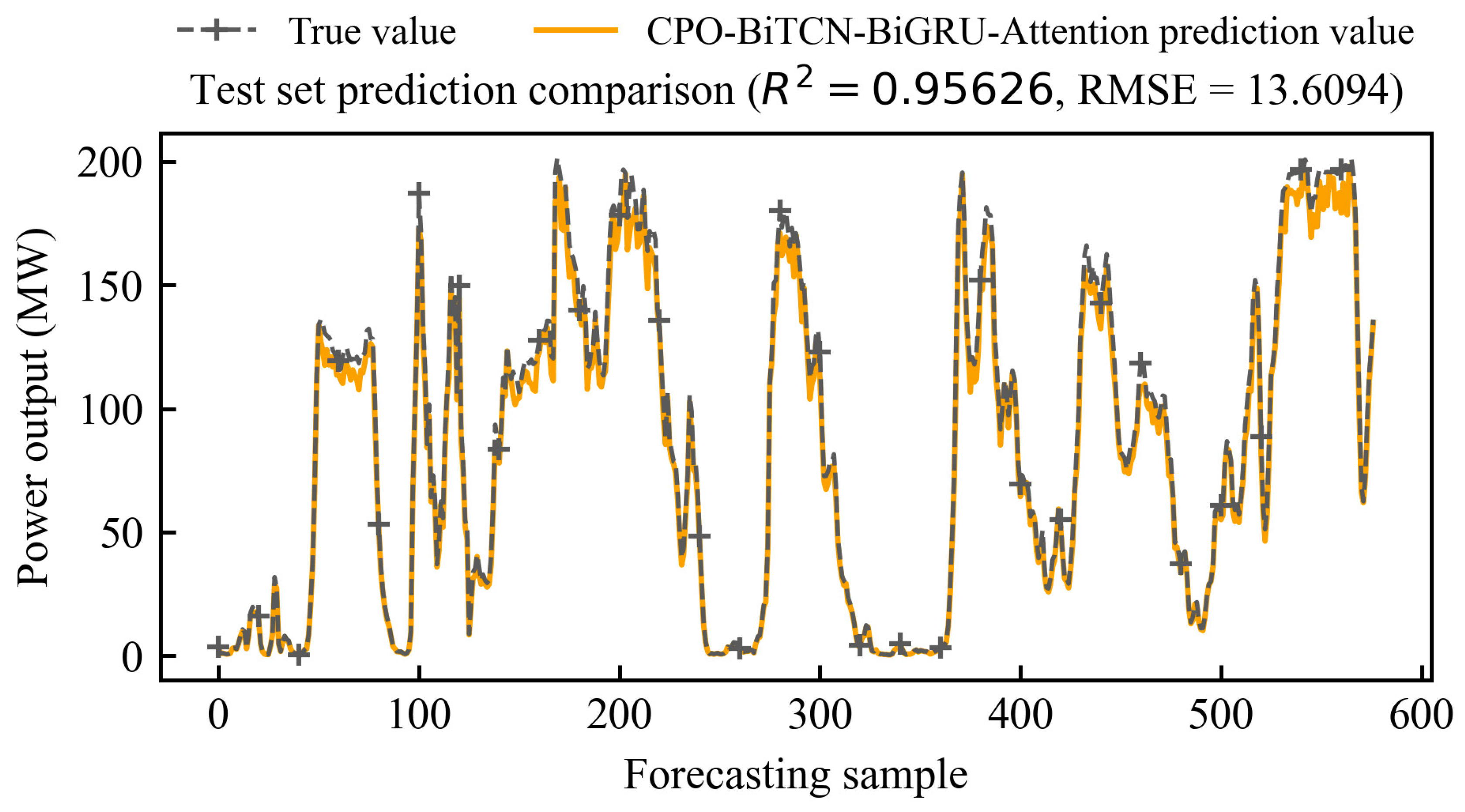 The further addition of the attention mechanism yields a marked reduction in MAPE to 17.71% (a 28.04% decrease relative to BiTCN-BiGRU), demonstrating the module’s ability to selectively emphasize critical “turning points” or ramp events while suppressing less informative steady-state periods. Crucially, the final introduction of the CPO algorithm for hyperparameter optimization unlocks the full potential of the hybrid architecture. The proposed CPO-BiTCN-BiGRU-Attention model achieves the best overall performance (MAE = 9.32 MW, MAPE = 8.41%), representing a 43.48% reduction in MAPE compared to the unoptimized variant. These results collectively validate the complementary nature of the framework: BiTCN denoises local features, BiGRU captures global evolution, Attention focuses on critical transitions, and CPO ensures the optimal structural configuration.