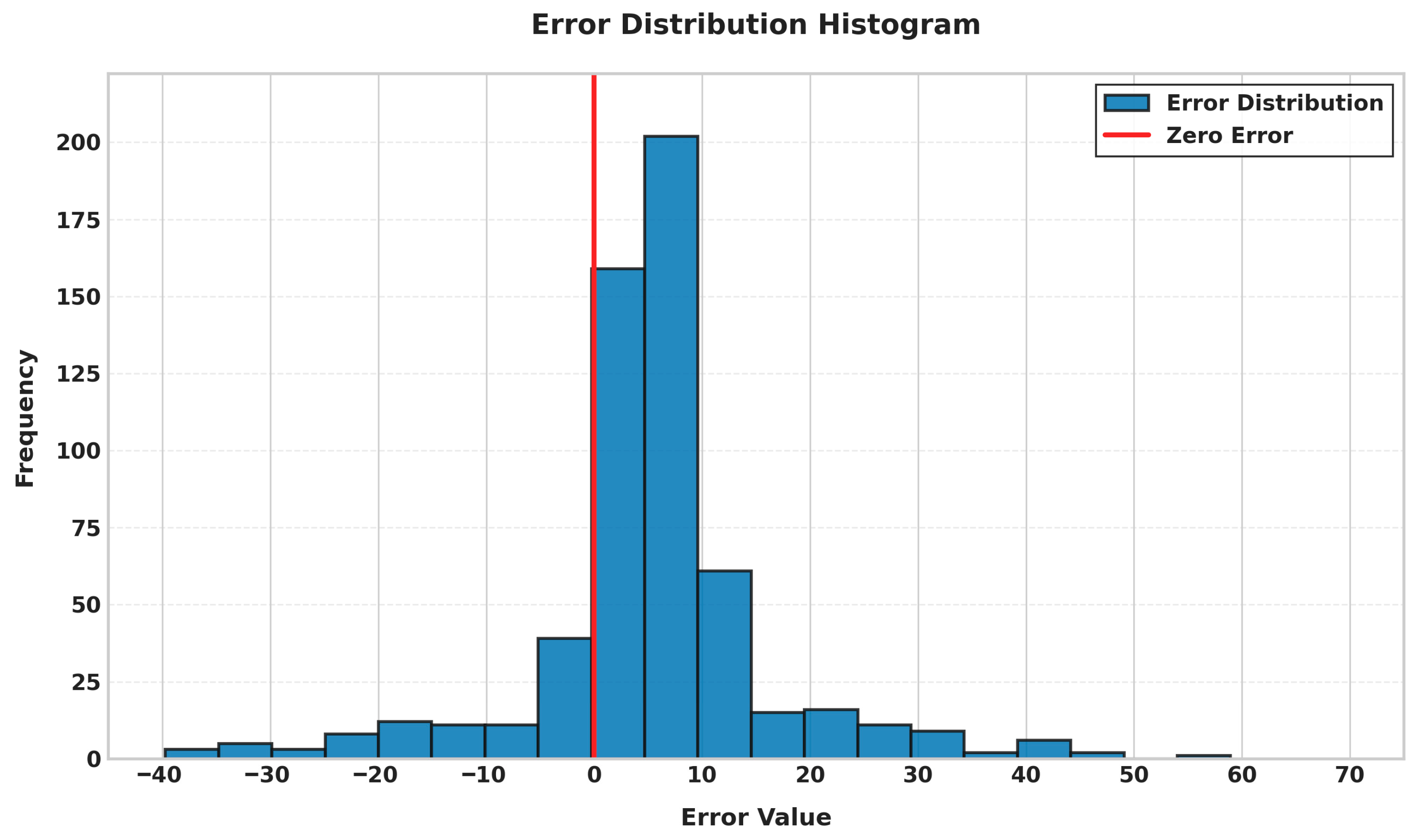 Figure 7 illustrates the distribution of prediction residuals of the proposed model. It can be observed that most errors are concentrated in a narrow range around zero, and the distribution exhibits an approximately symmetric, bell-shaped form. This suggests that the model predictions are largely unbiased and consistent across different operating conditions.