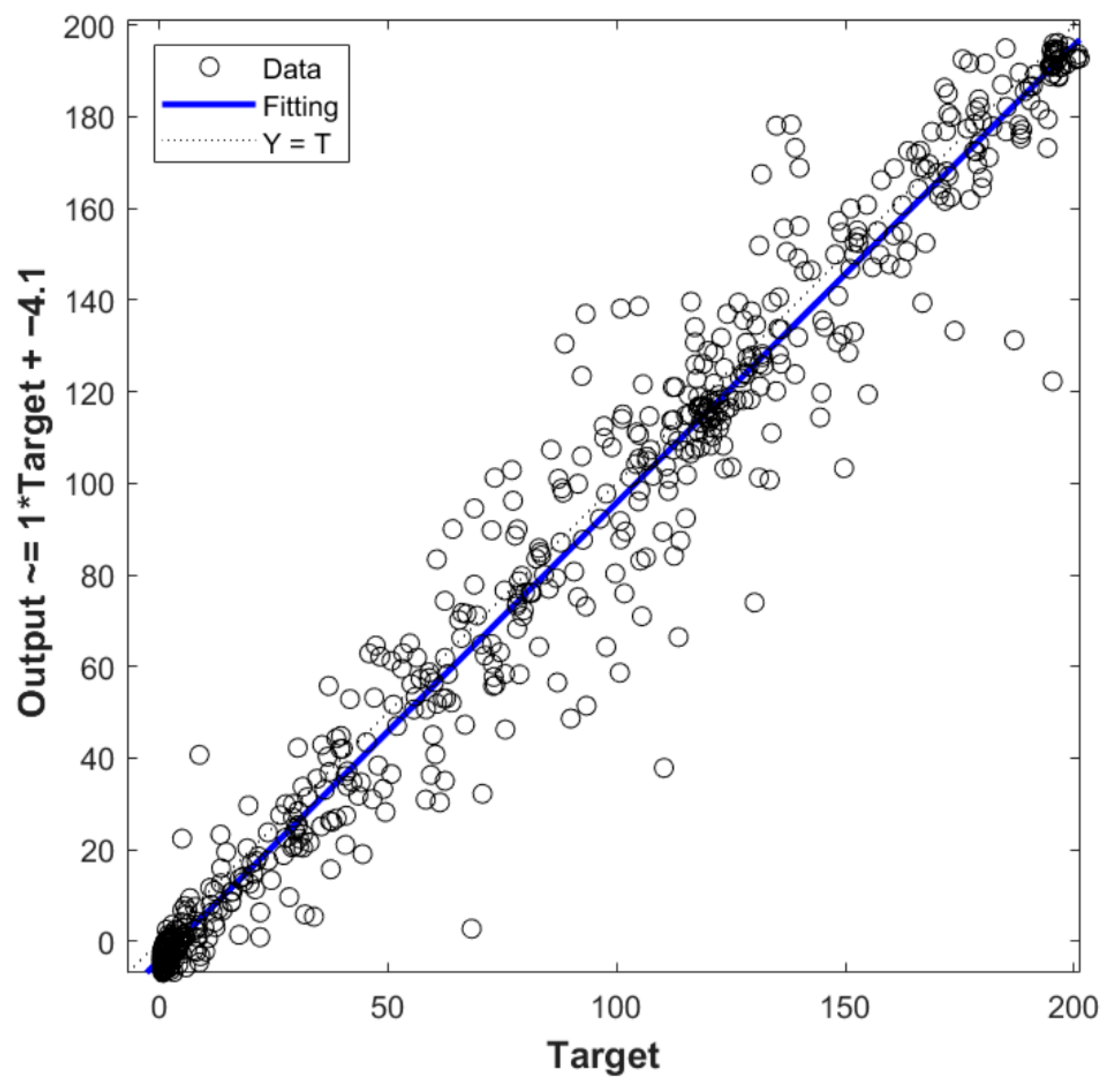 Figure 8. The regression line equation was Output ≈ 1 × Target ± 4.1. This indicates a strong linear correlation between the predicted and actual values, further verifying the high prediction accuracy of the model.