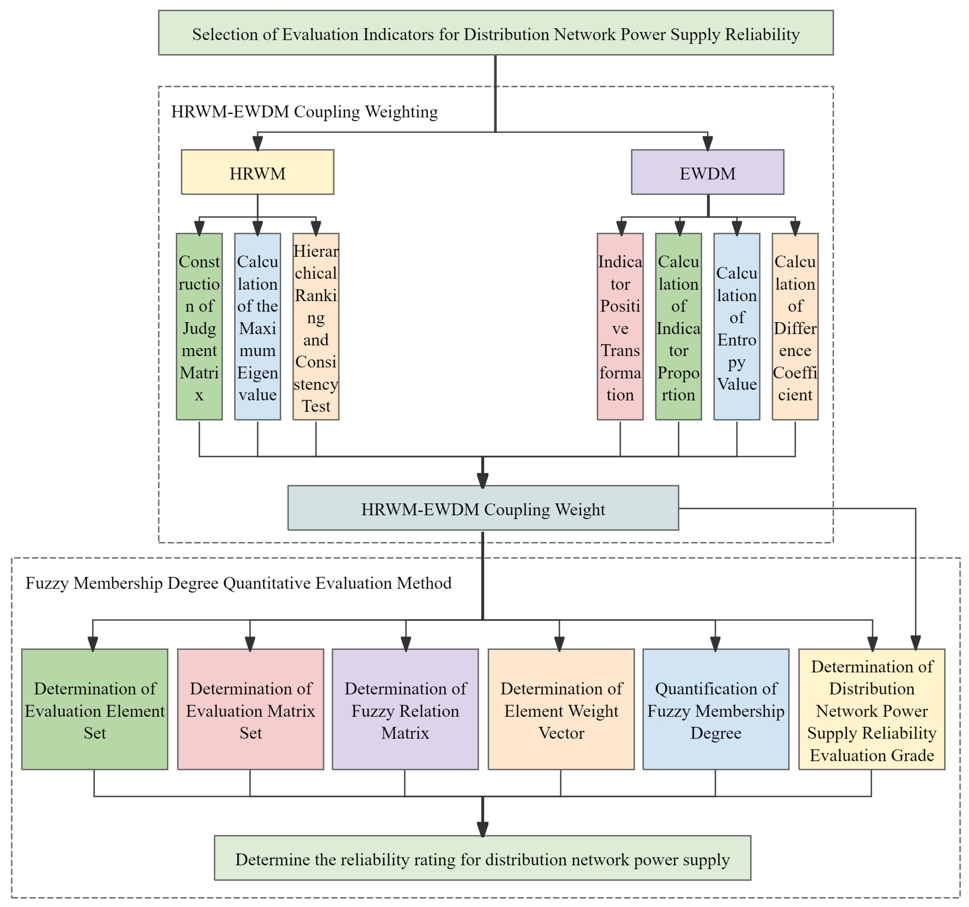 Combined with experts’ long-term practice and professional knowledge in power grid planning, operation and maintenance control, fault analysis, and other fields, the relative importance and recursive relationship of each hierarchical index are determined. Such quantitative analysis, which integrates expert domain experience with hierarchical recursion and weight balancing, can not only effectively handle the problem of multi-factor coupling in complex systems but also fully explore the potential logical relationships among various factors, providing a more scientific and accurate basis for distribution network power supply reliability assessment. The steps of determining the weights of indicators of the HRWM include