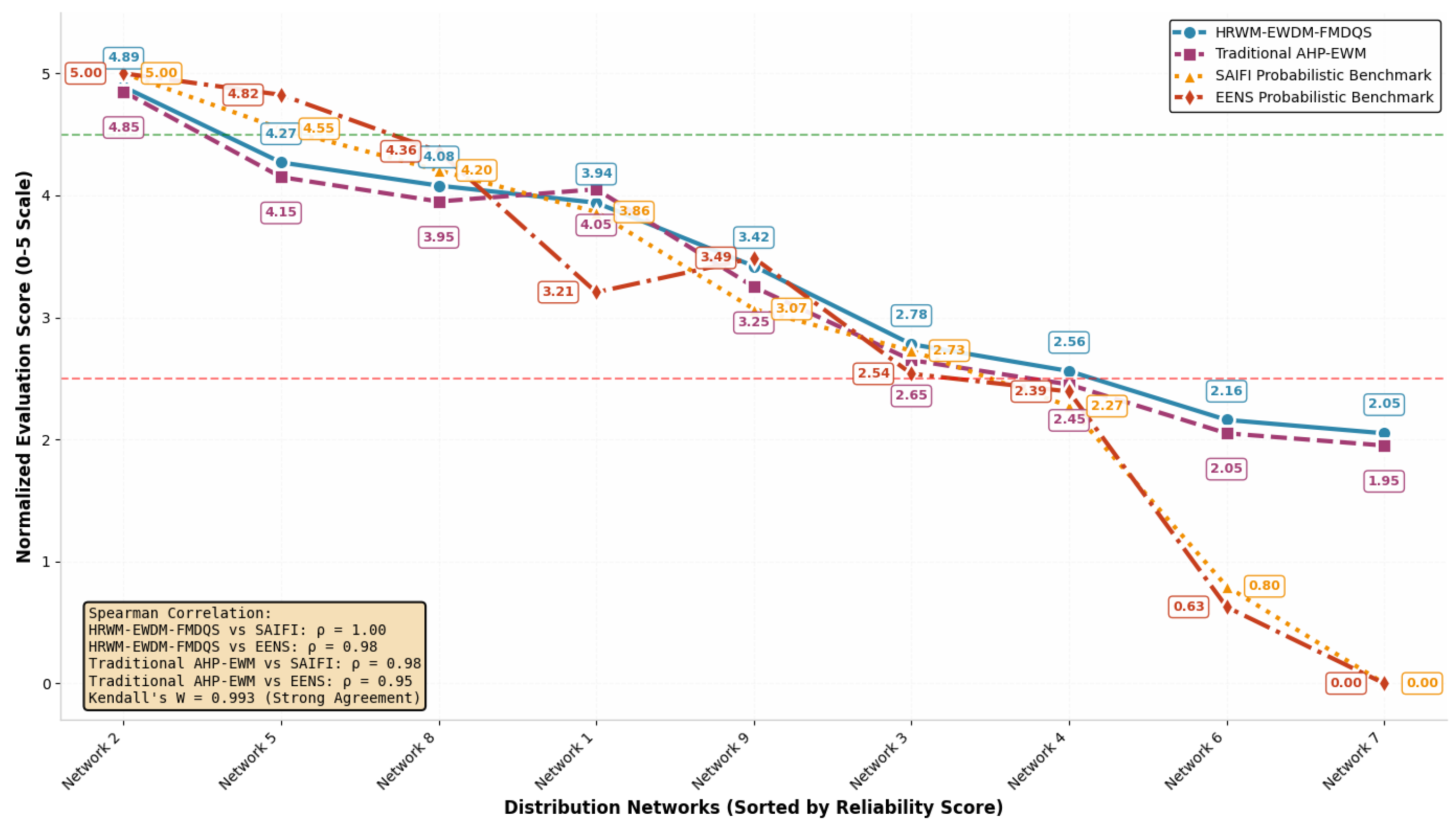 According to the professional background and experience level of the experts, the weighted aggregation method is adopted to calculate the final scoring results: the weight of university experts (6 persons) is 0.3, the weight of electric power enterprise technical backbones (10 persons) is 0.45, and the weight of research institution experts (4 persons) is 0.25 (the weight is determined based on the proportion of experts in each field and their practical experience in distribution network reliability evaluation). The final judgment matrix (A, A1-A5) of the HRWM is constructed based on the aggregated scoring results, which fully integrate the professional advantages of experts in different fields and avoid the one-sidedness of individual expert judgment.