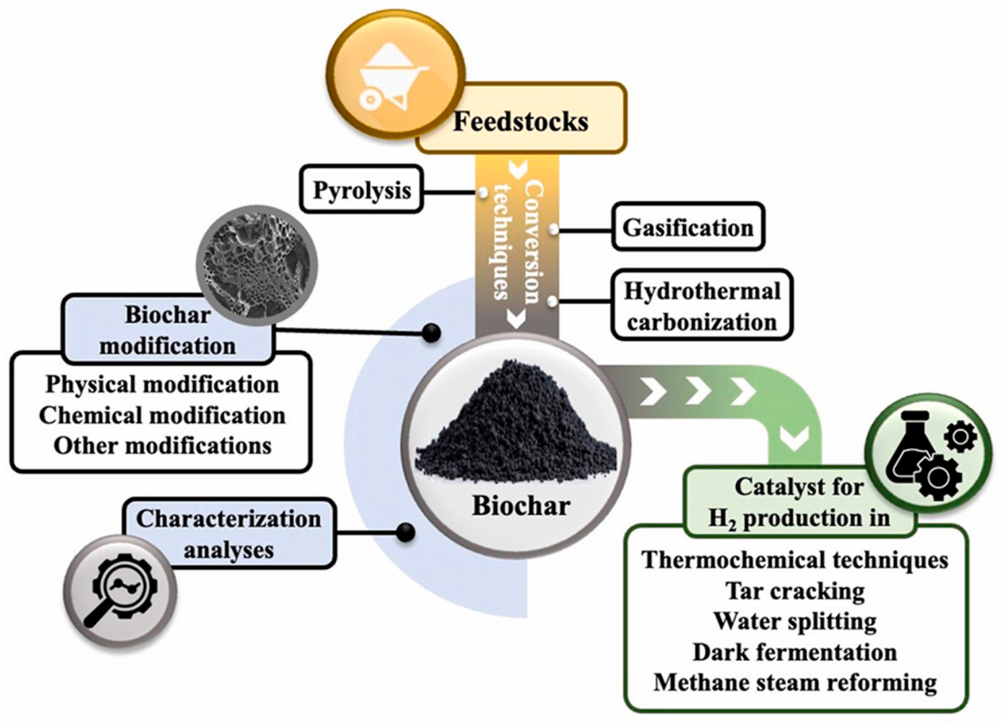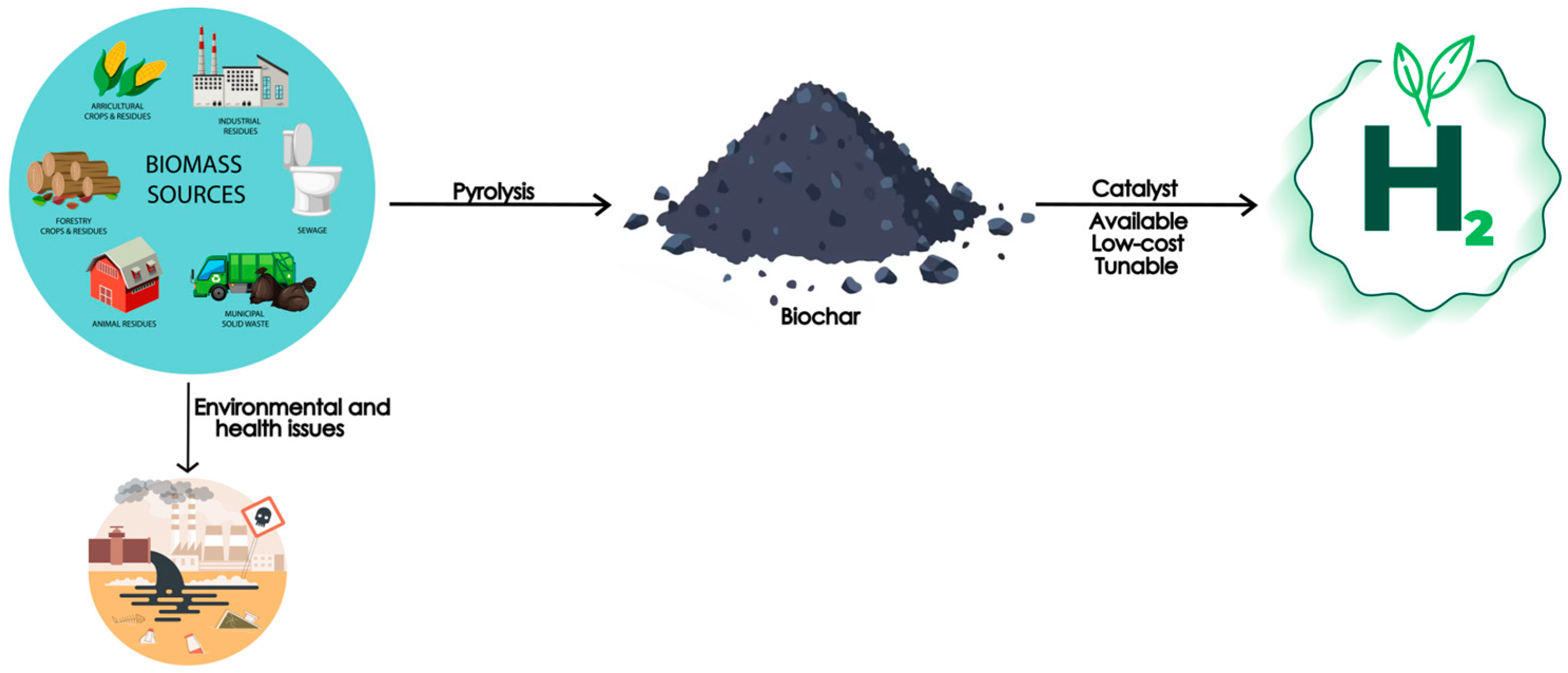 - System level integration: The evaluation of biochar catalytic performance in a whole functioning plant is necessary; techno-economical studies, a life-cycle assessment, and compatibility with existing hydrogen technologies are important in order to accelerate the maturity of biochar in the global hydrogen production.