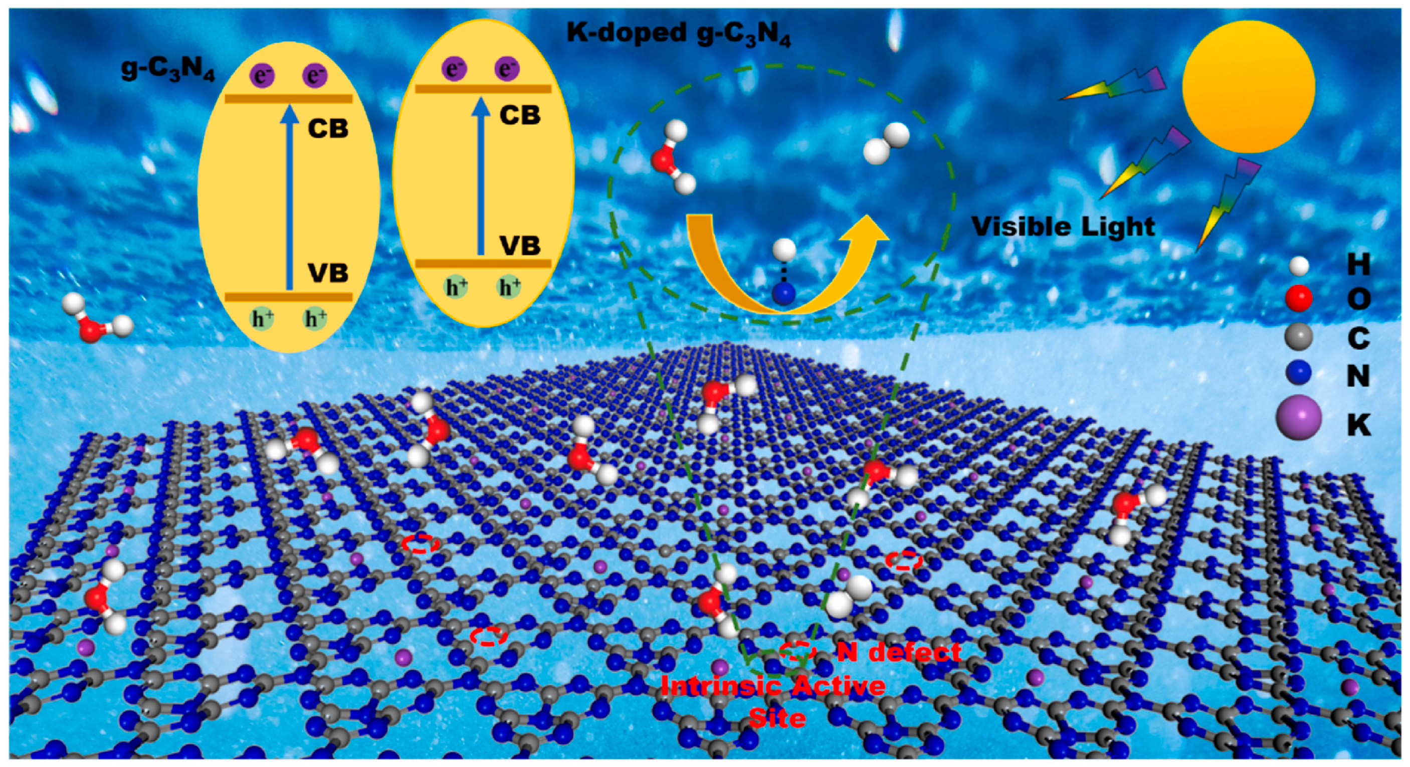 - Wei, X.; Shen, J.; Chen, Z.; Li, H.; Zong, K.; Yang, L.; Jin, M.; Chen, Z.; Wang, X.; Chen, Z. Boosting Photocatalytic H2 Production on K-Doped Porous g-C3N4 Nanosheets: Mechanism Exploration from Both Experimental and DFT Studies. Int. J. Hydrogen Energy 2025, 161, 150465. [Google Scholar] [CrossRef]