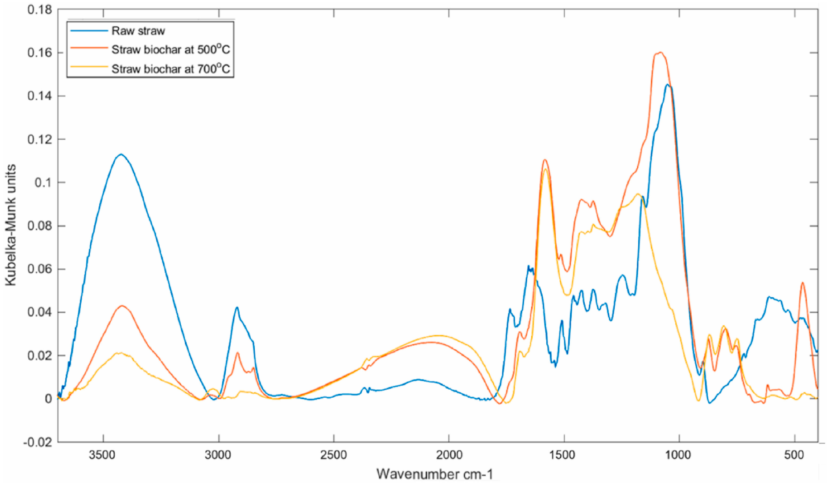 - Janu, R.; Mrlik, V.; Ribitsch, D.; Hofman, J.; Sedláček, P.; Bielská, L.; Soja, G. Biochar Surface Functional Groups as Affected by Biomass Feedstock, Biochar Composition and Pyrolysis Temperature. Carbon Resour. Convers. 2021, 4, 36–46. [Google Scholar] [CrossRef]