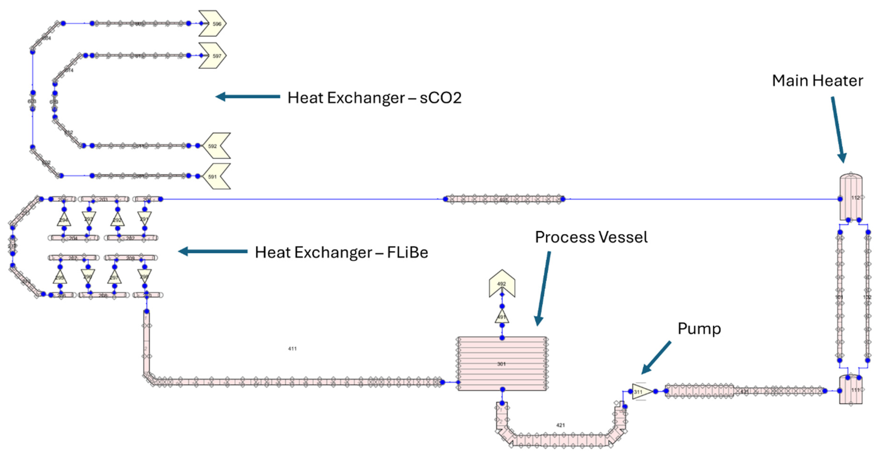 Each PIPE component is coupled with an HTSTR component, representing the shell and insulation layers of the heat exchanger. These components exchange heat internally with the FLiBe and externally with the surrounding environment.