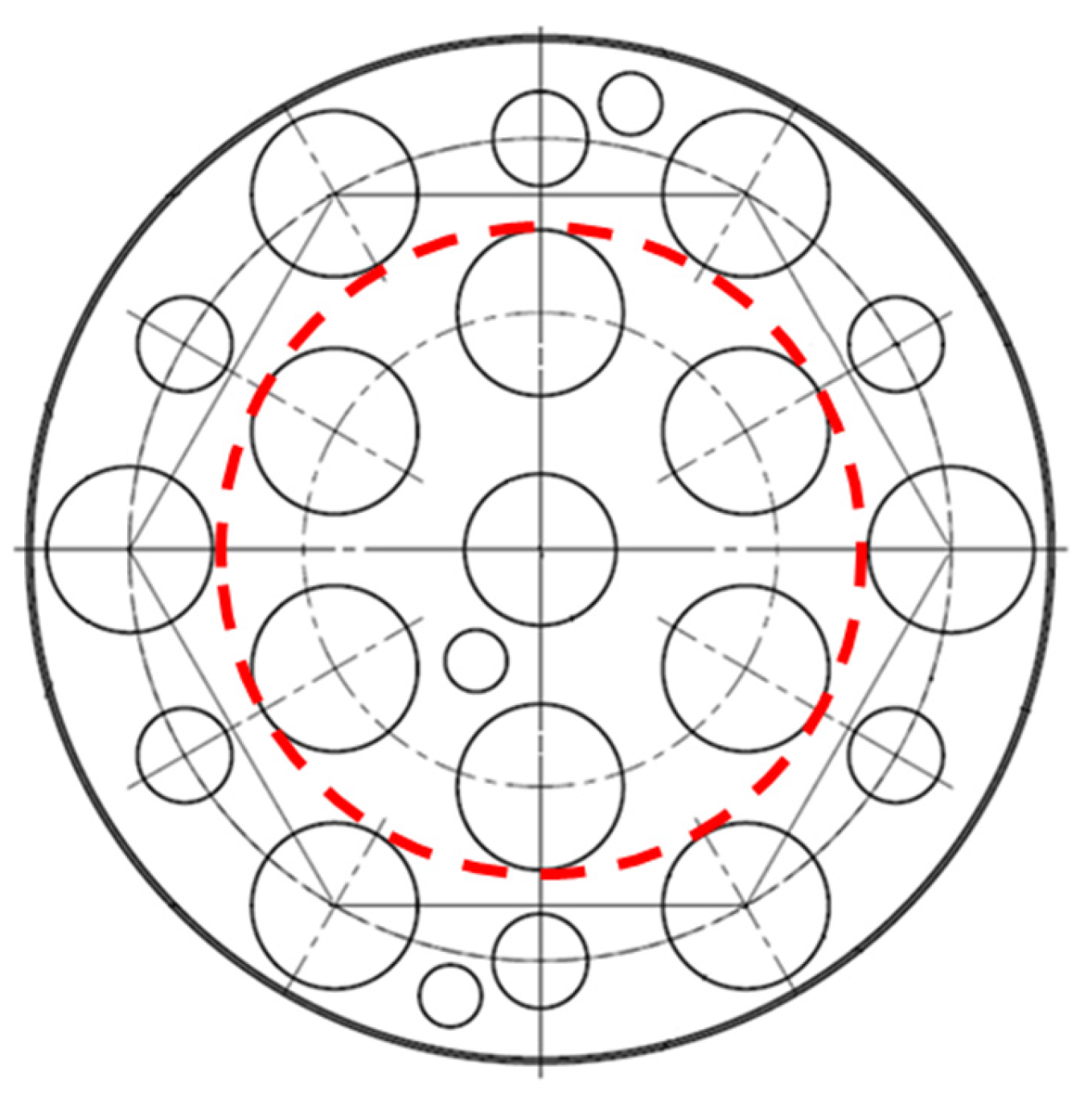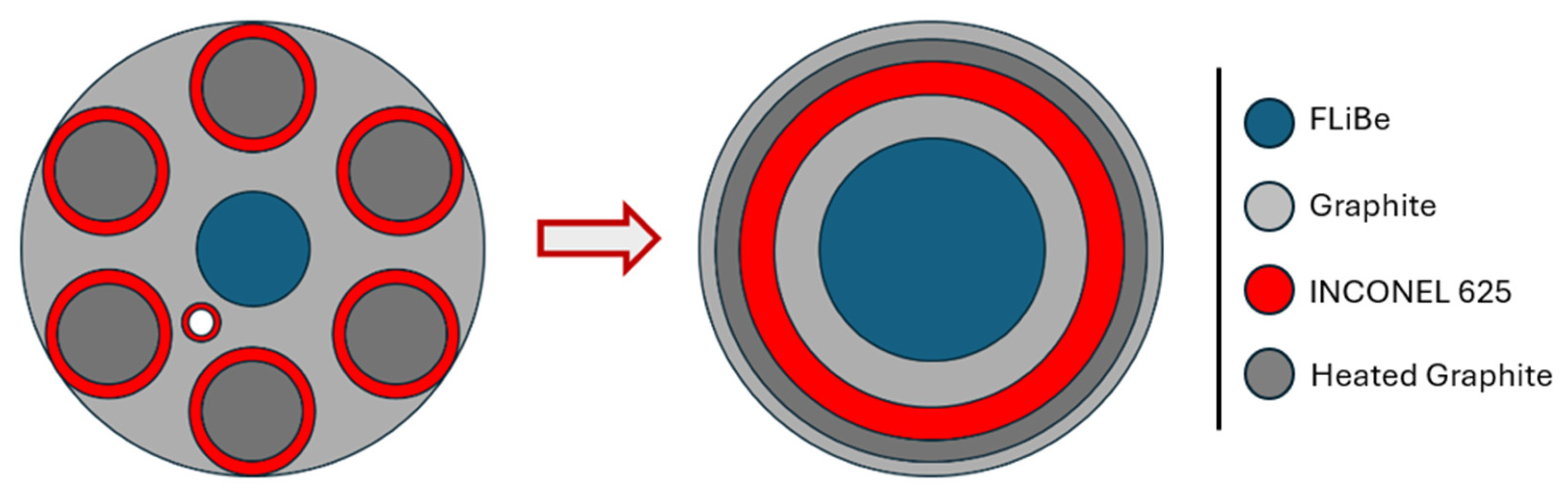 Figure 2, each represented by a PIPE component. The central circle has a diameter of around 67 mm and includes the central FLiBe channel, six heating rods and one thermocouple channel. The development of the equivalent cross-section begins with the central FLiBe channel, which retains its original dimensions. The first layer surrounding the fluid is made of graphite, encompassing all graphite within a circle passing through the centers of the heating rods. Next, there are two layers representing the material of the heating rods: an INCONEL 625 layer, including the thermocouple channel, and a layer for the heated graphite. Finally, an outer graphite layer represents the remaining matrix material. The result is shown in
