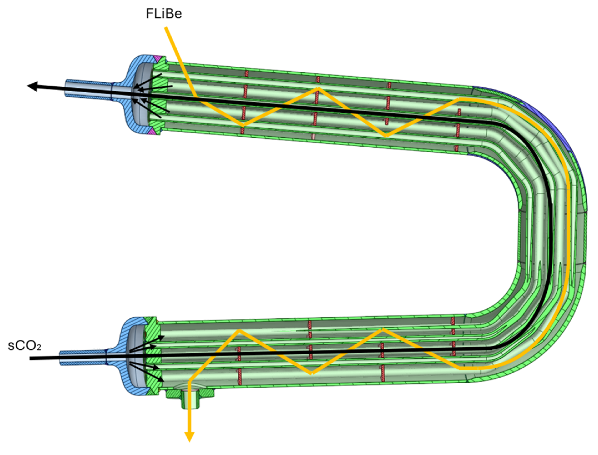2 flows inside the tubes while the FLiBe flows externally. The FLiBe enters from the top and exits from the bottom, flowing through free volume and encountering baffles. These obstacles, arranged in groups of four within the straight section, enhance heat transfer. On the other hand, the sCO
