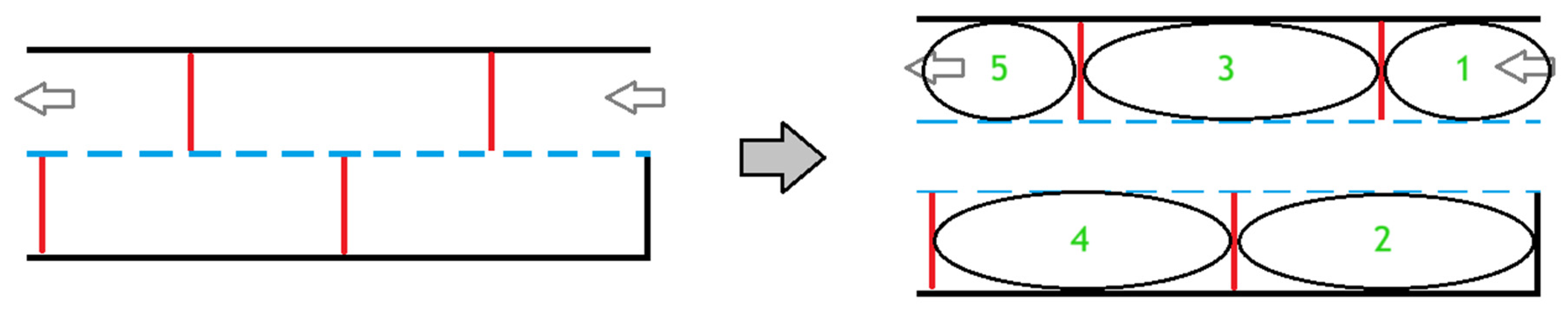 Figure 5, this approach involves horizontally dividing the section in half, so that each half includes two baffles. Then, for each space between two baffles, or between the section inlet/outlet and a baffle, a PIPE component is defined. The dimensions of the PIPE components are equal to the volume occupied by FLiBe in that section. The connection between the upper and lower halves is made laterally by pairing cells, where each cell in the upper half connects to its corresponding cell in the lower half using single-junction components.