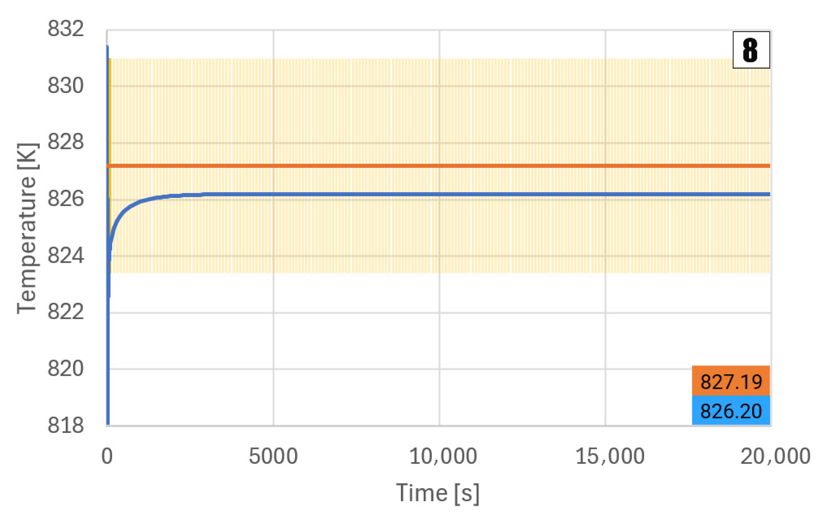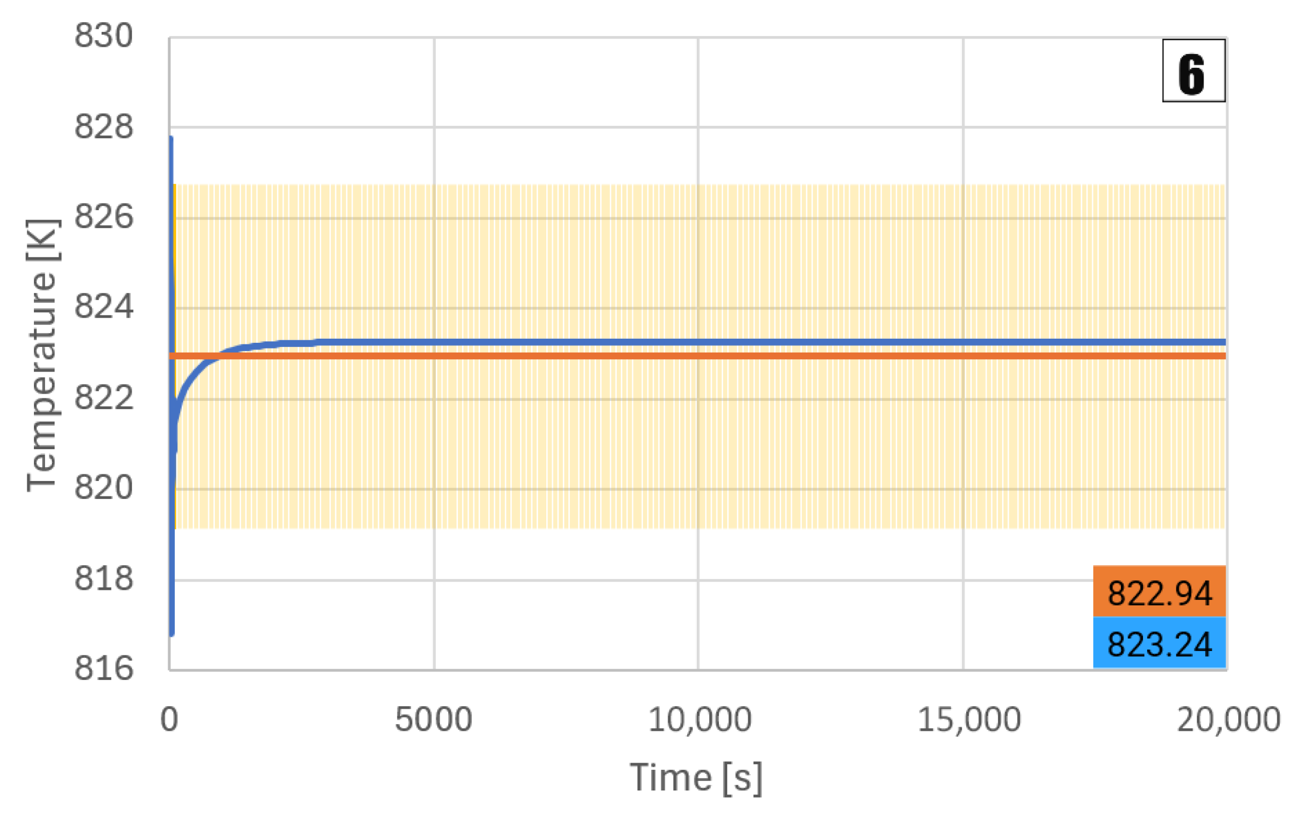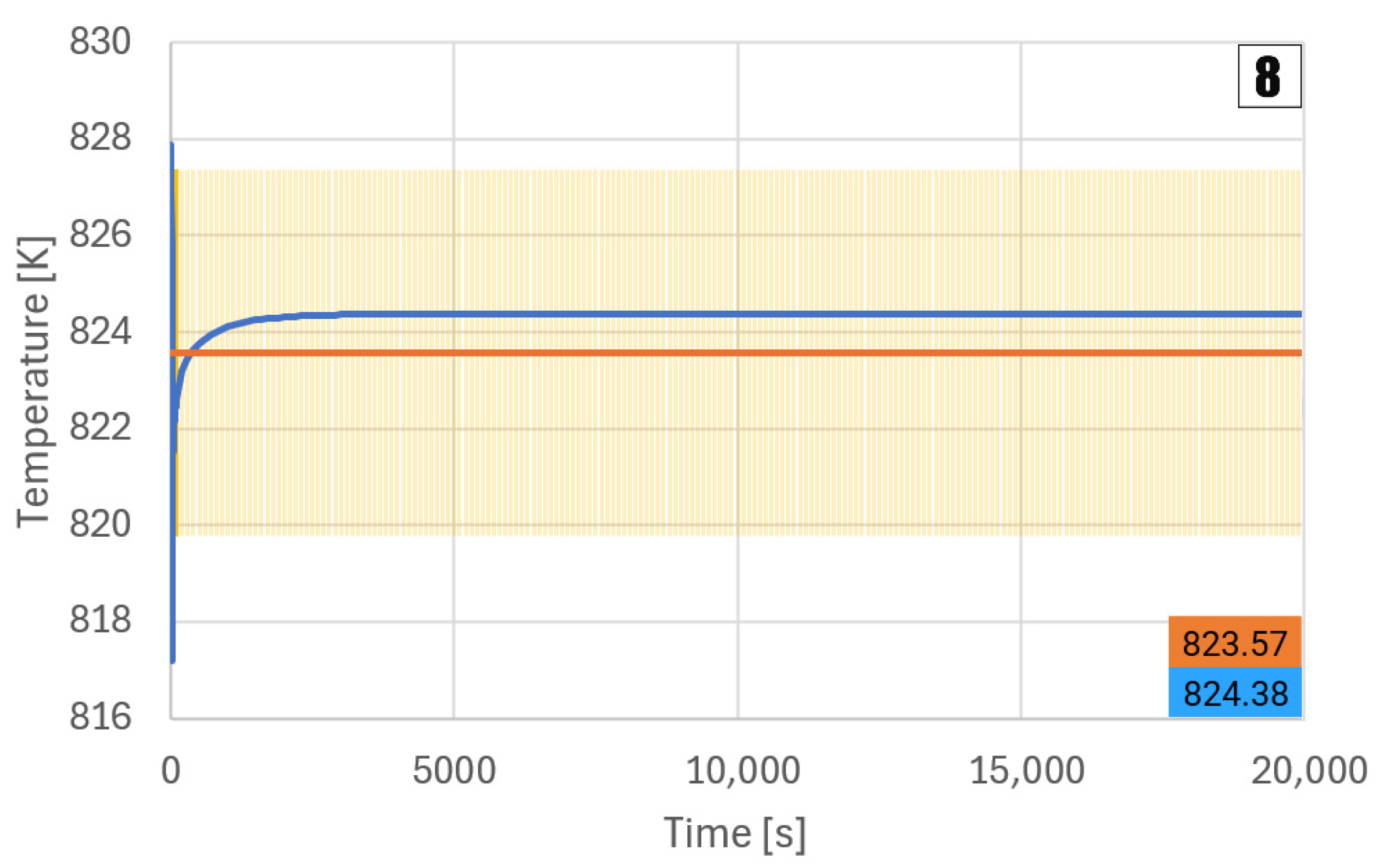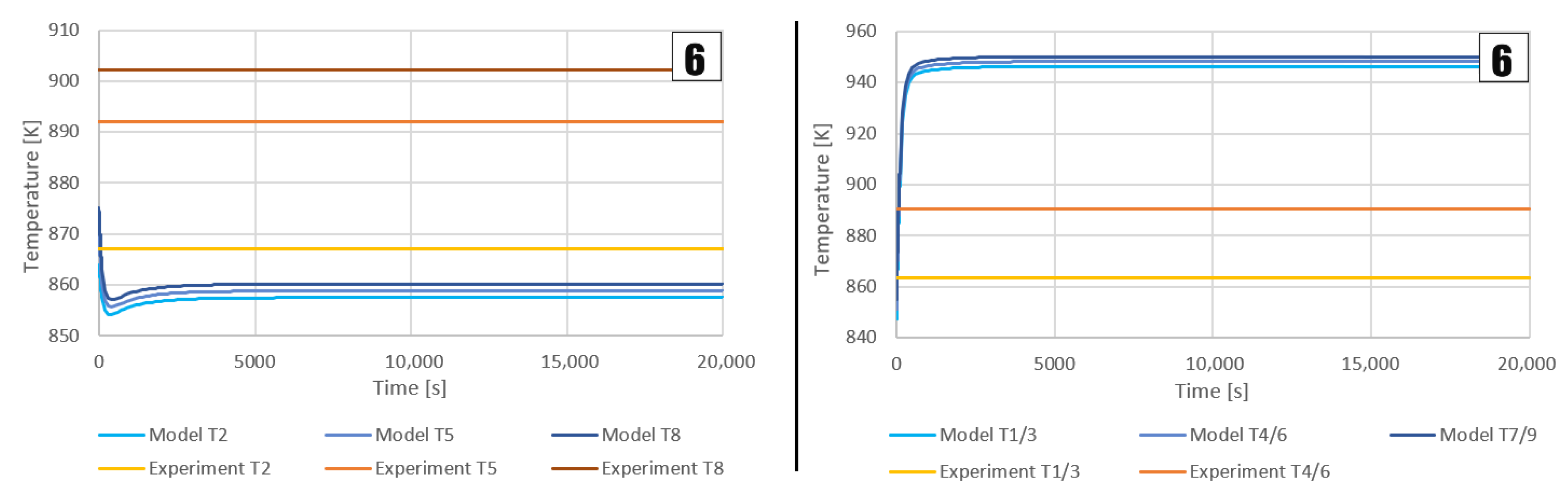 2 layer thickness in the heat exchanger’s HTSTR components was modified in order to reach a temperature at the main heater inlet, matching Case 6. The value reached is equal to 823.24 K, which is close to the experimental value and within the range of uncertainty. For Case 8, the result is 824.38 K, which is consistent as well. However, for this case, the model was not further adjusted.