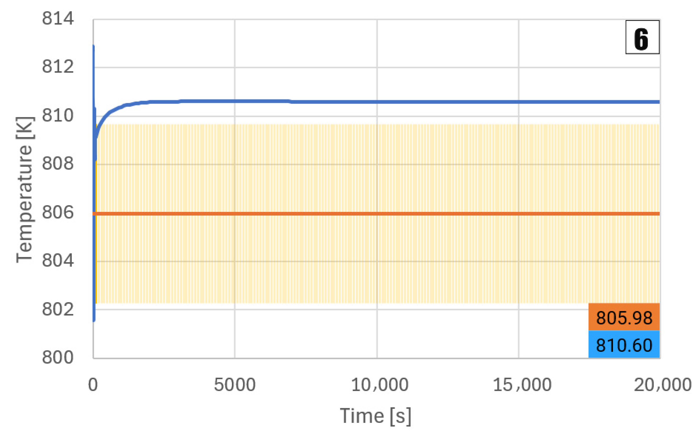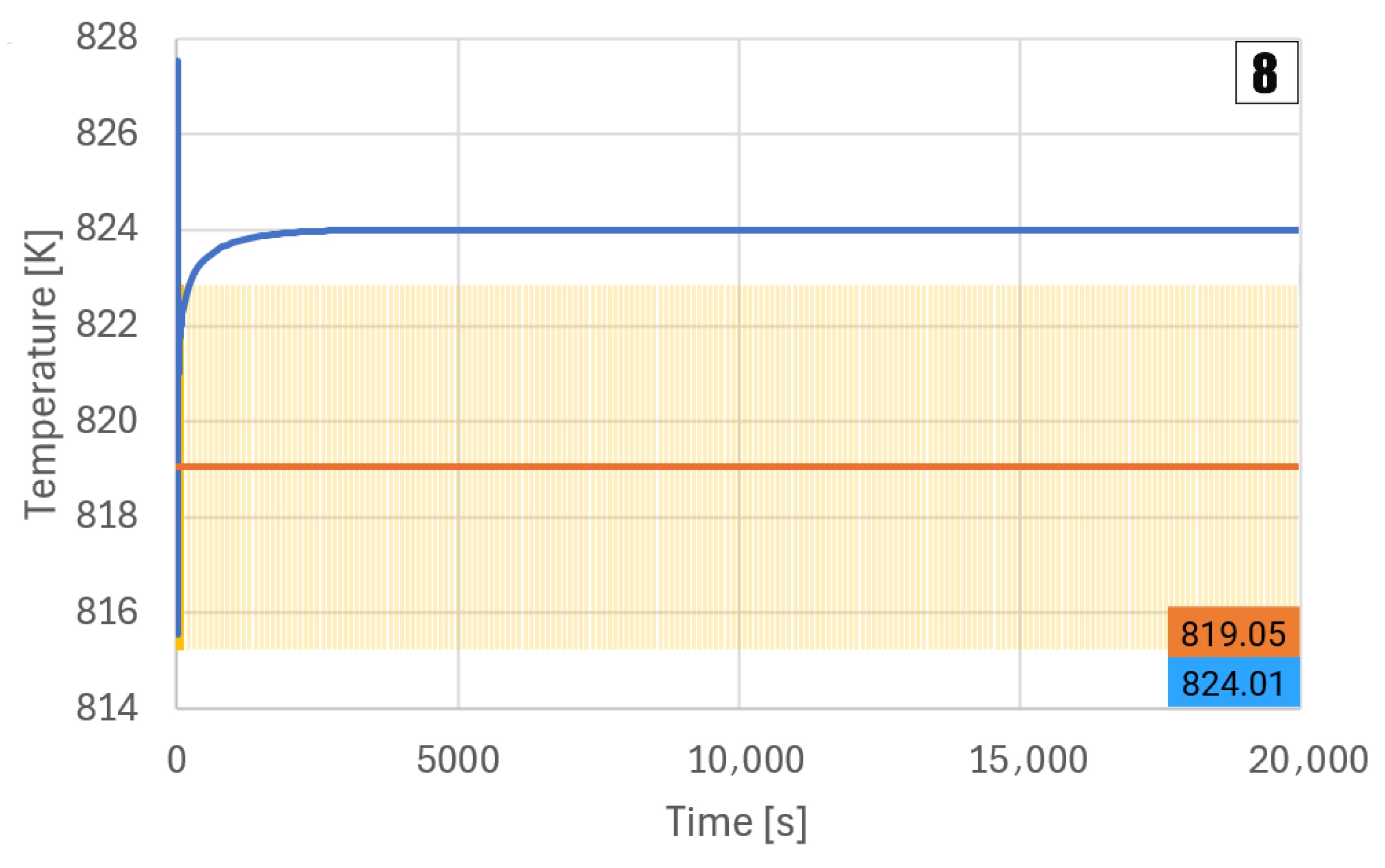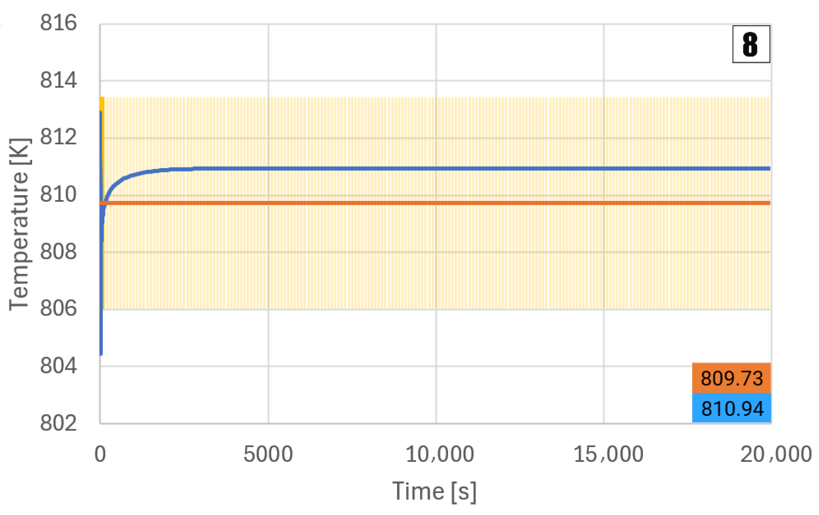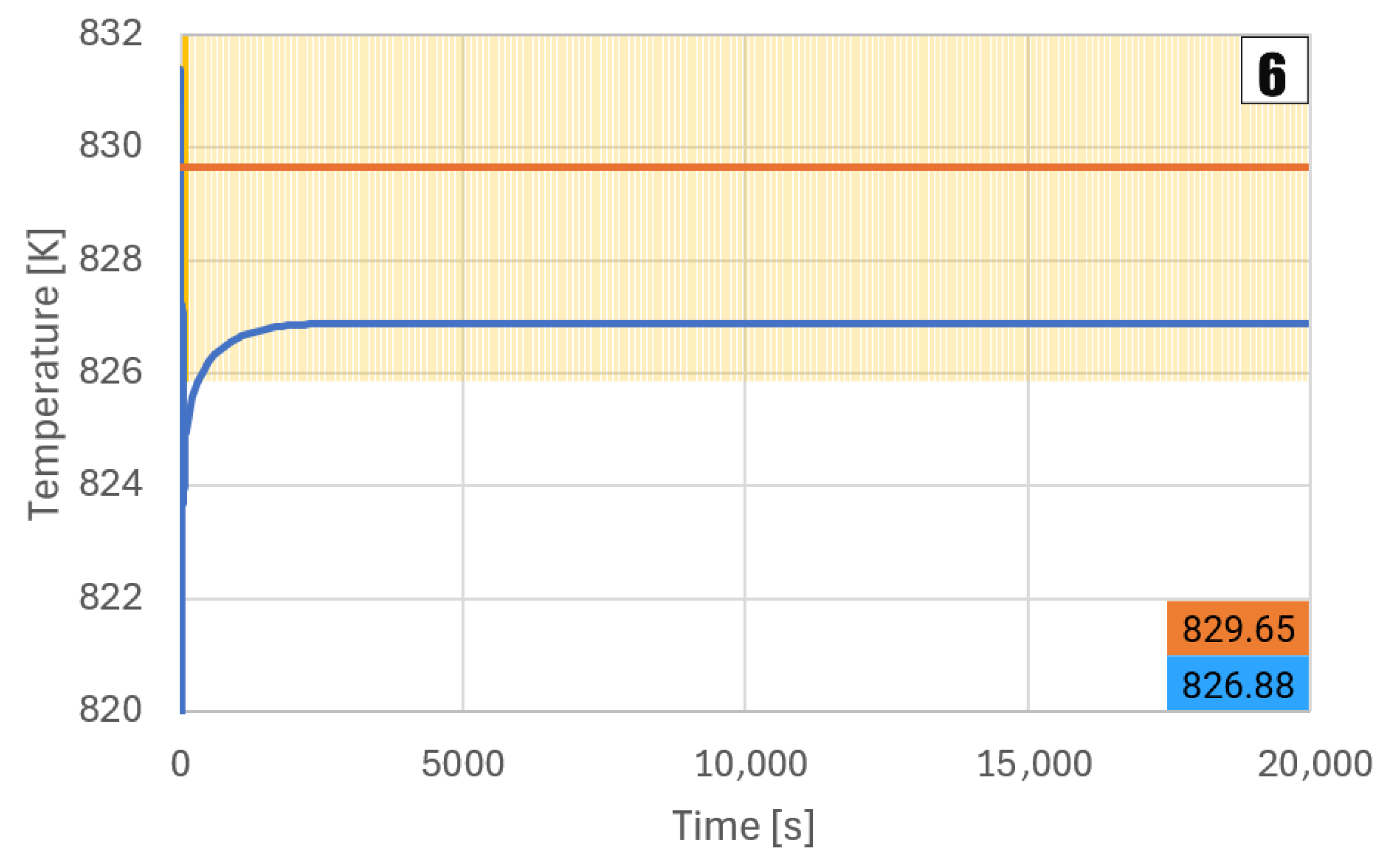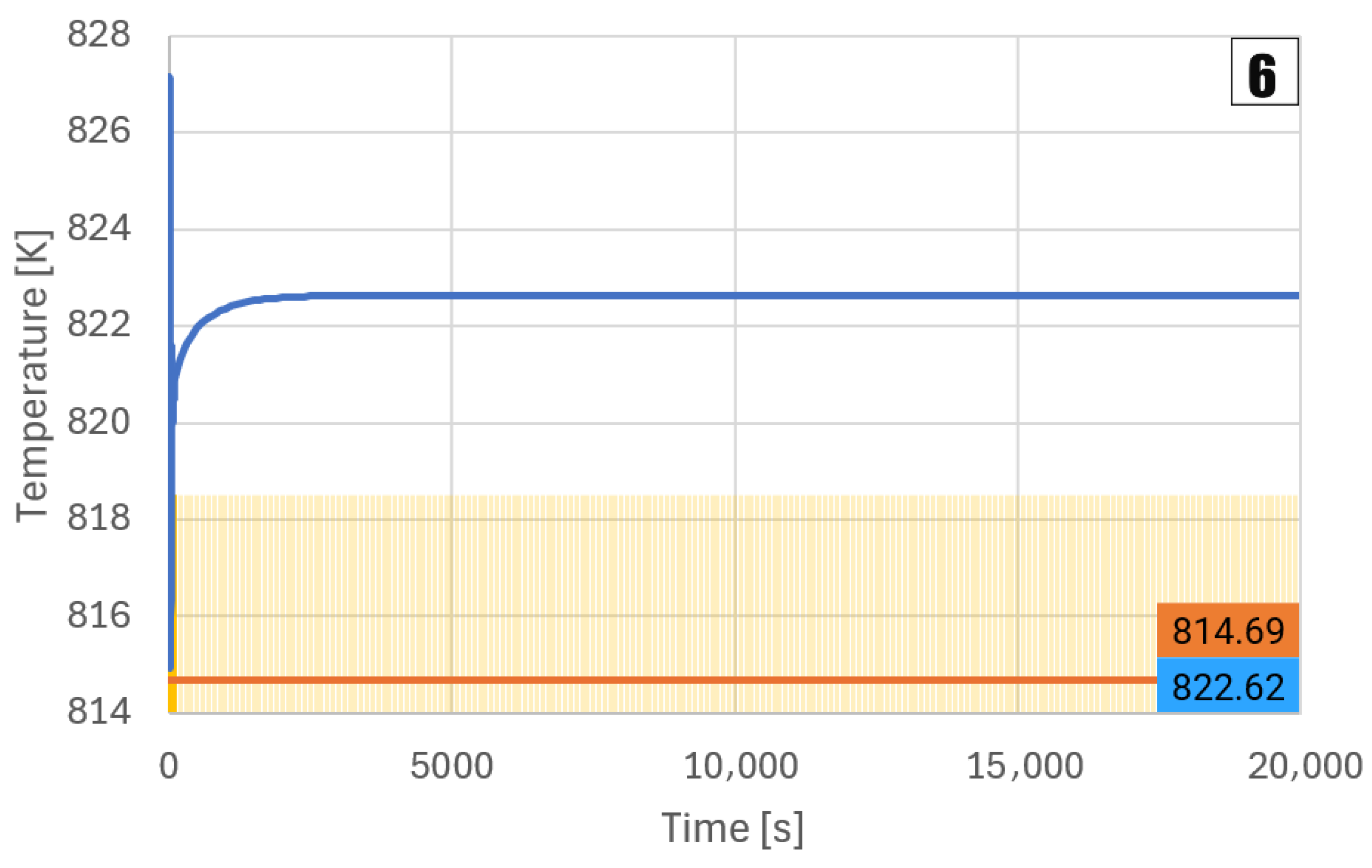 2 layer thickness in the heat exchanger’s HTSTR components was modified in order to reach a temperature at the main heater inlet, matching Case 6. The value reached is equal to 823.24 K, which is close to the experimental value and within the range of uncertainty. For Case 8, the result is 824.38 K, which is consistent as well. However, for this case, the model was not further adjusted.