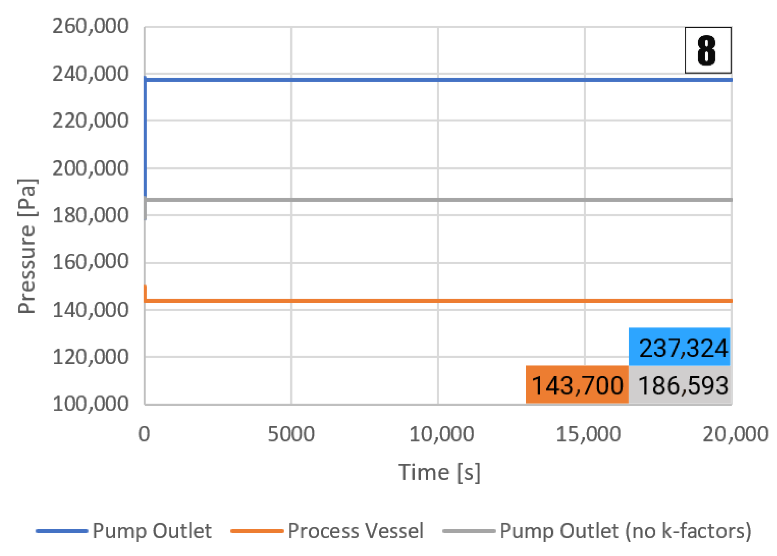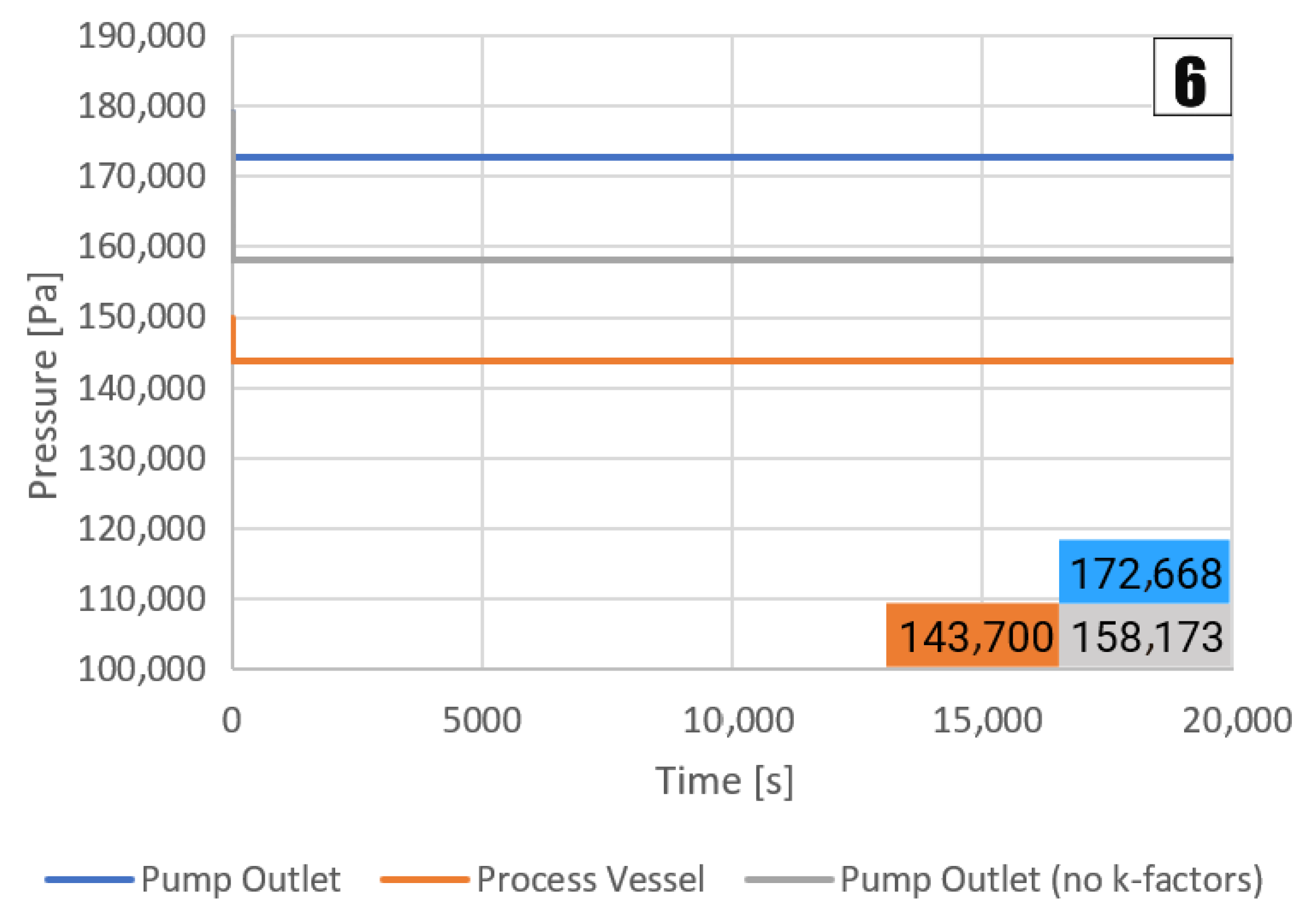 Table 2 differs. It does not include the “dead” pressure difference between the sensors. A simulation was performed without assigning k-factors to the model, resulting in the grey line. The difference between the two pump measurements correspond to the experimental pressure differential. For Case 6, this value is equal to 14,495 Pa, which is consistent compared to the experimental 10,700 Pa, taking into account the pressure loss correlations and simplifications adopted.