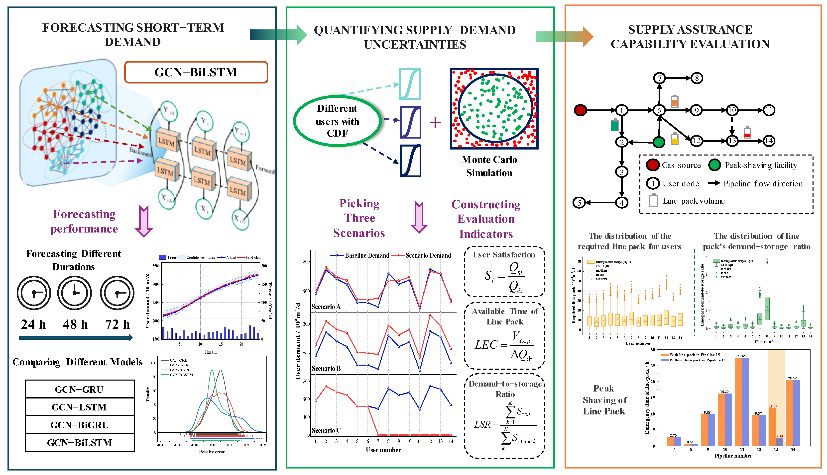 - Integrated Framework: Unlike studies that treat forecasting and evaluation separately, this work bridges the gap by using the probabilistic outputs (CDF) of the GCN-BiLSTM model as direct inputs for the line pack evaluation, transforming ‘data uncertainty’ into ‘supply risk’.