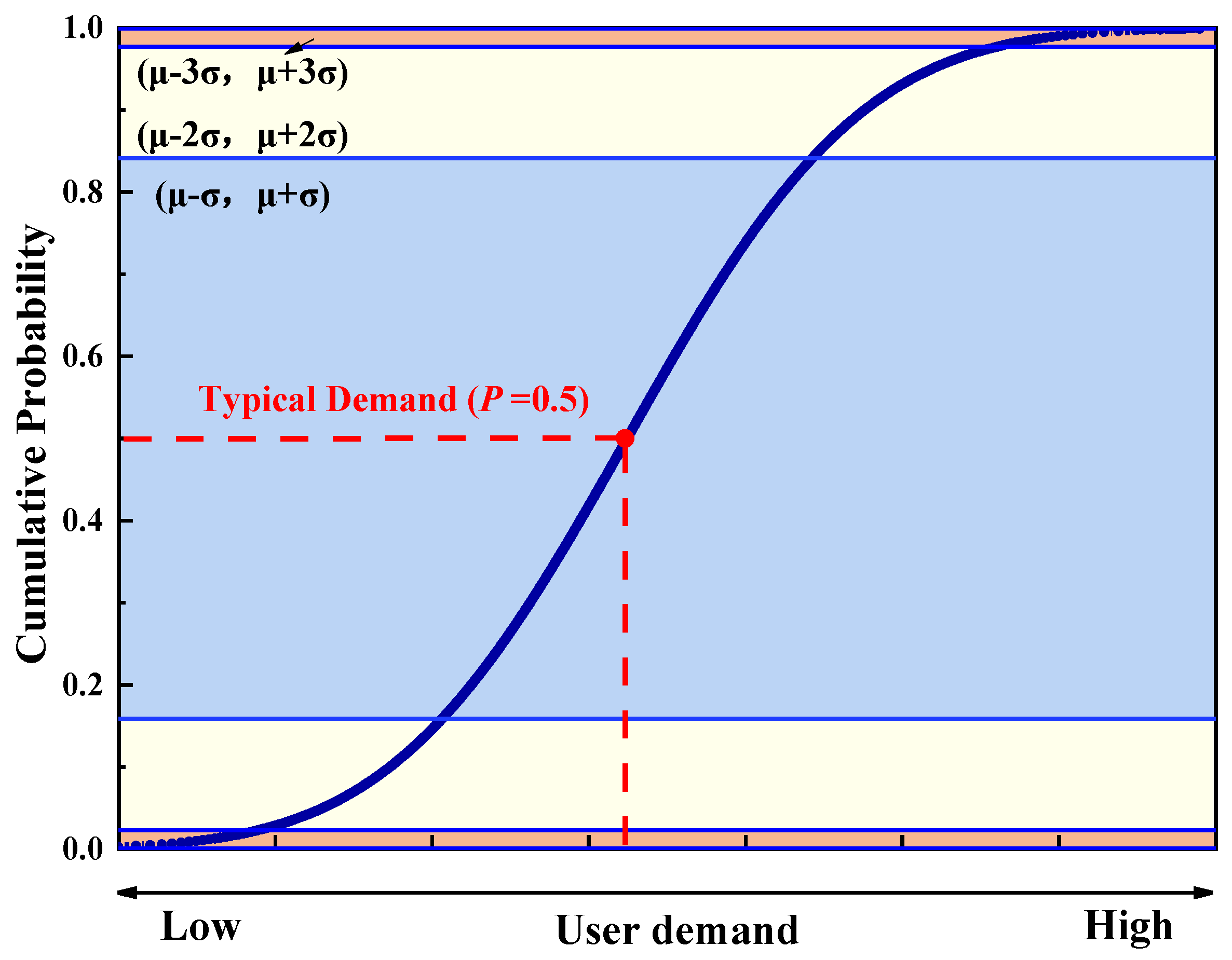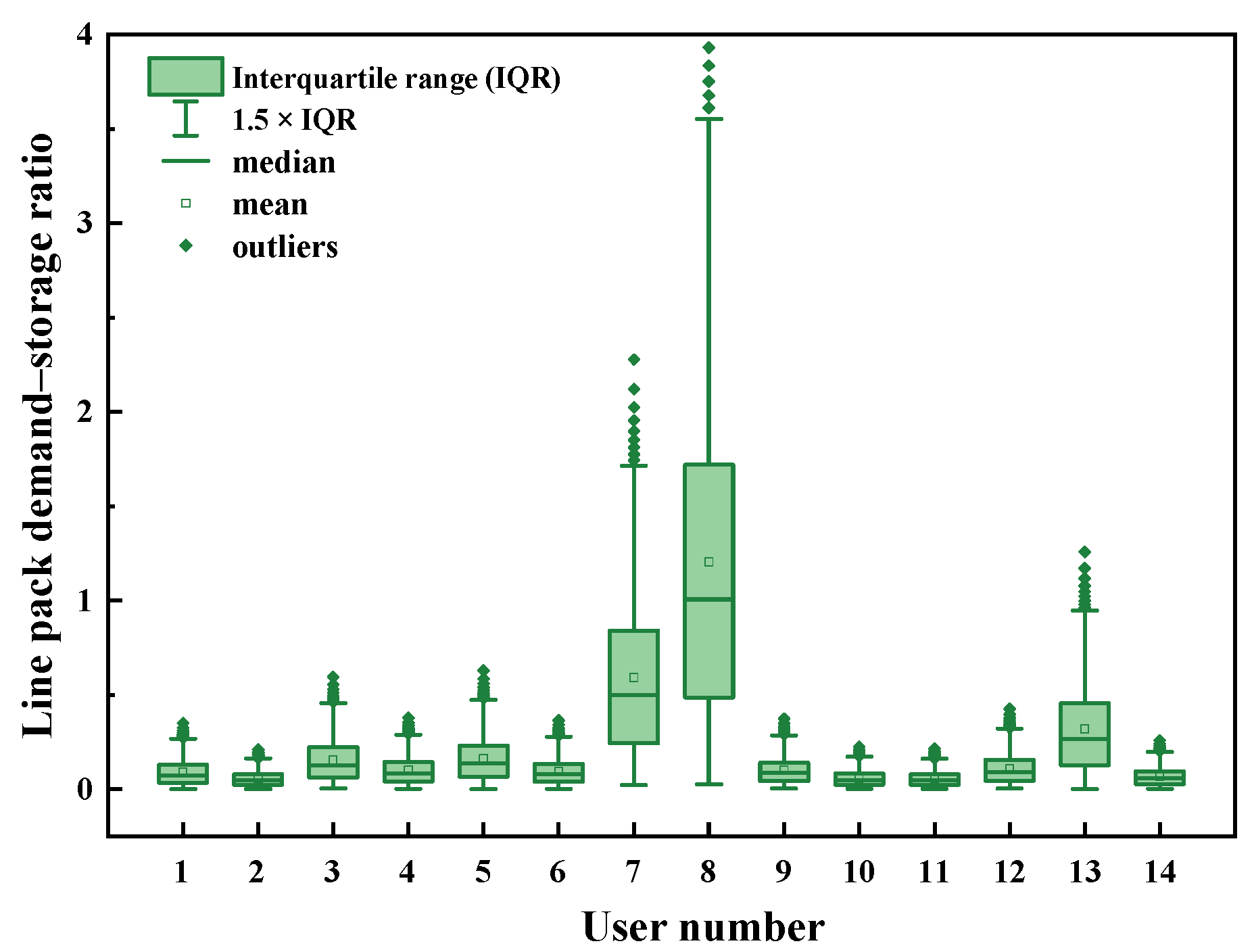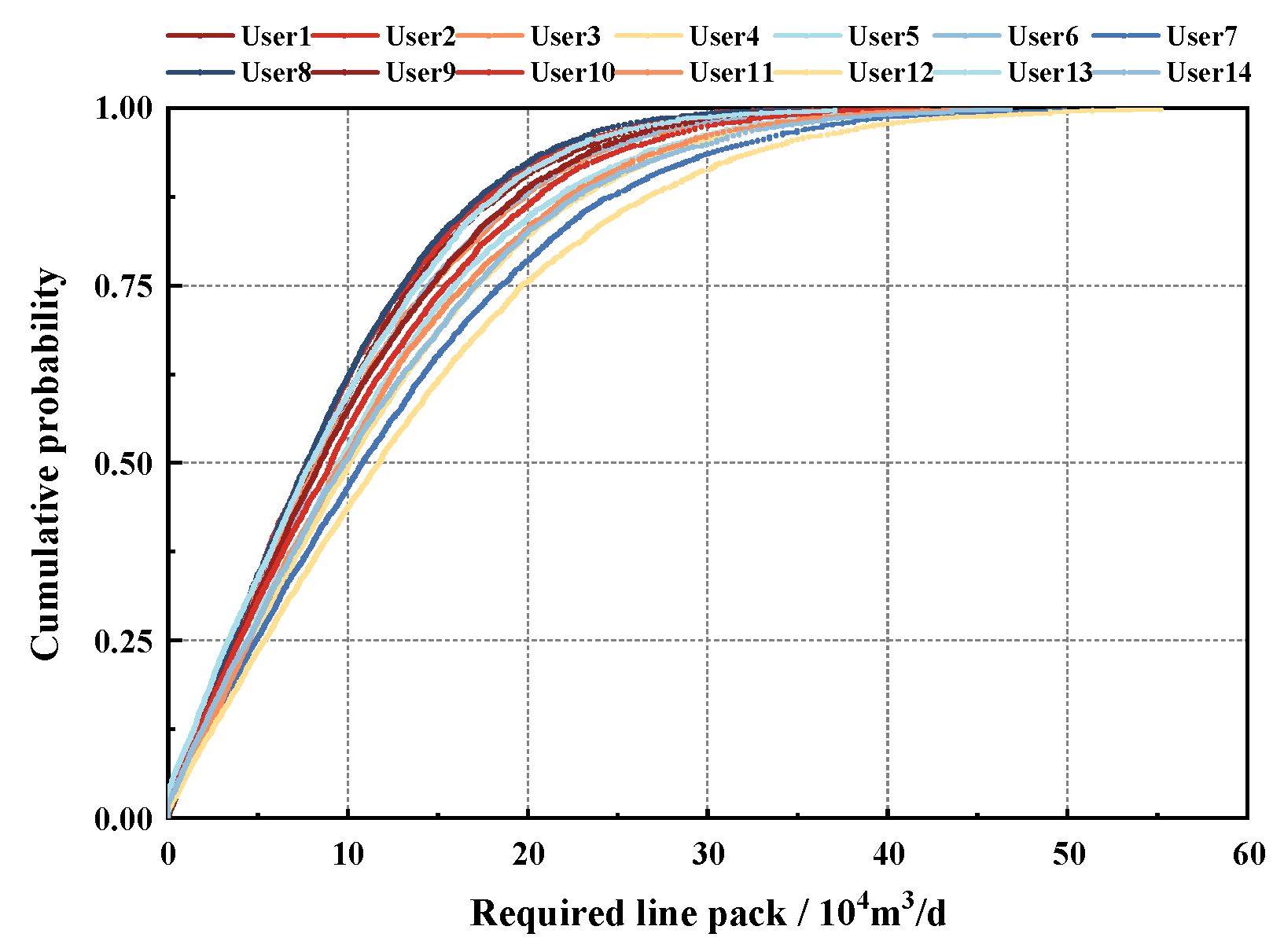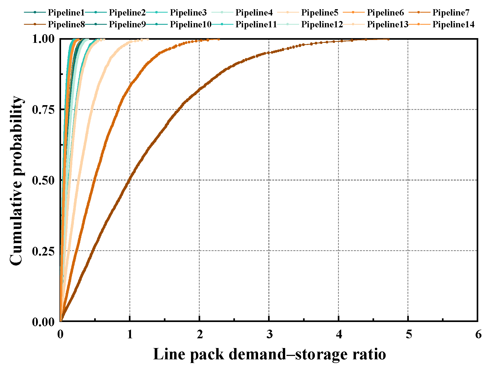 - To quantify the required line pack and the line pack demand−storage ratio, the demand CDF of each user was first obtained using the forecasting method. Monte Carlo sampling was then used to generate a set of representative demand scenarios. For each scenario, the required line pack and the demand−storage ratio were calculated. The CDFs of these indicators were further derived to provide a probabilistic description of supply assurance margins.