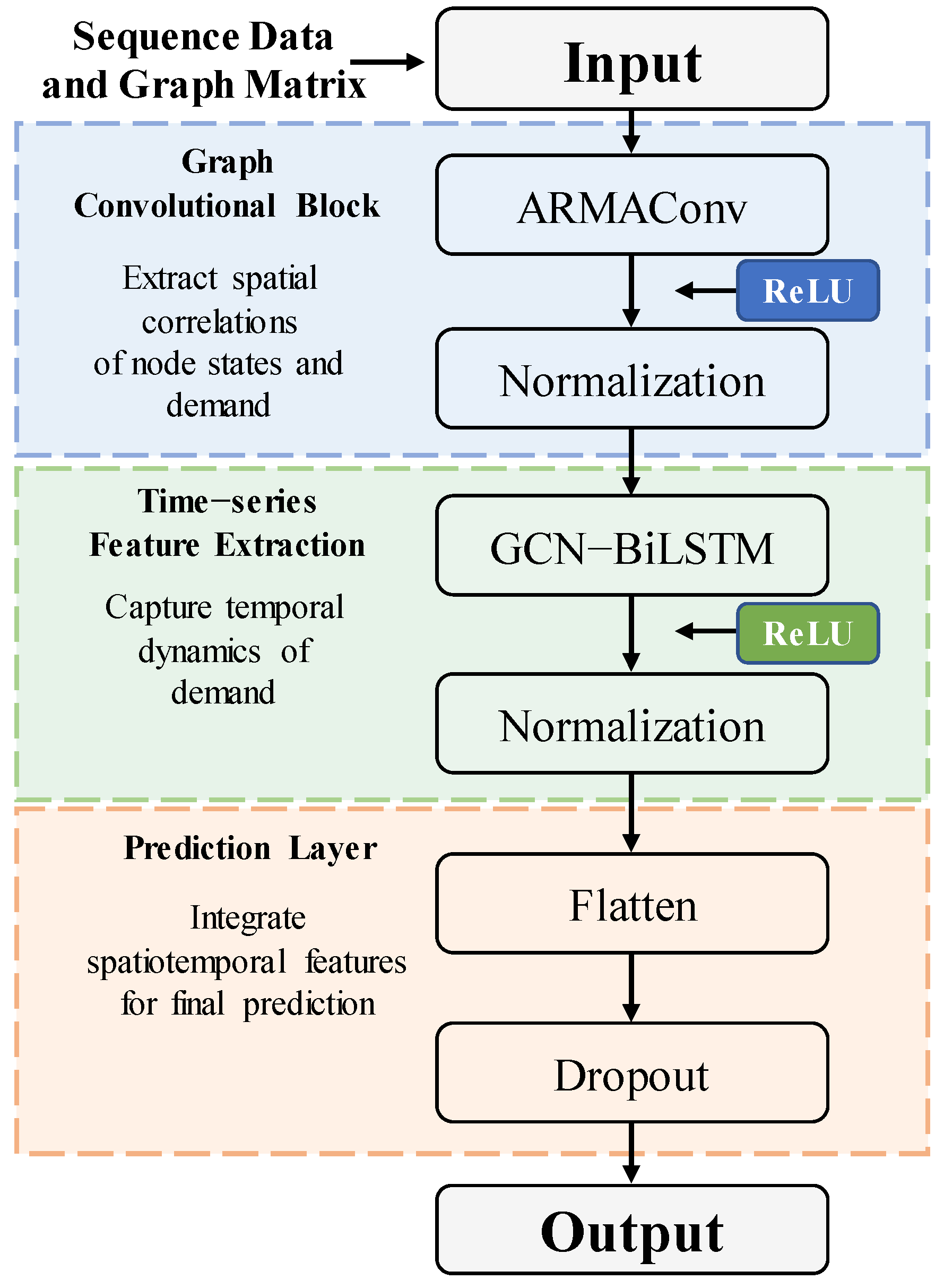 - a novel GCN-BiLSTM model with uncertainty quantification has been developed to capture both the topological dependencies and temporal dynamics of user demand. Empirical validation on real-world datasets demonstrates the model’s superiority over classical baselines, achieving a mean absolute percentage error of less than 1% and an R2 exceeding 0.99. Crucially, beyond deterministic accuracy, the model constructs reliable confidence intervals via the Cumulative Distribution Function, providing a probabilistic basis for risk-informed decision-making.