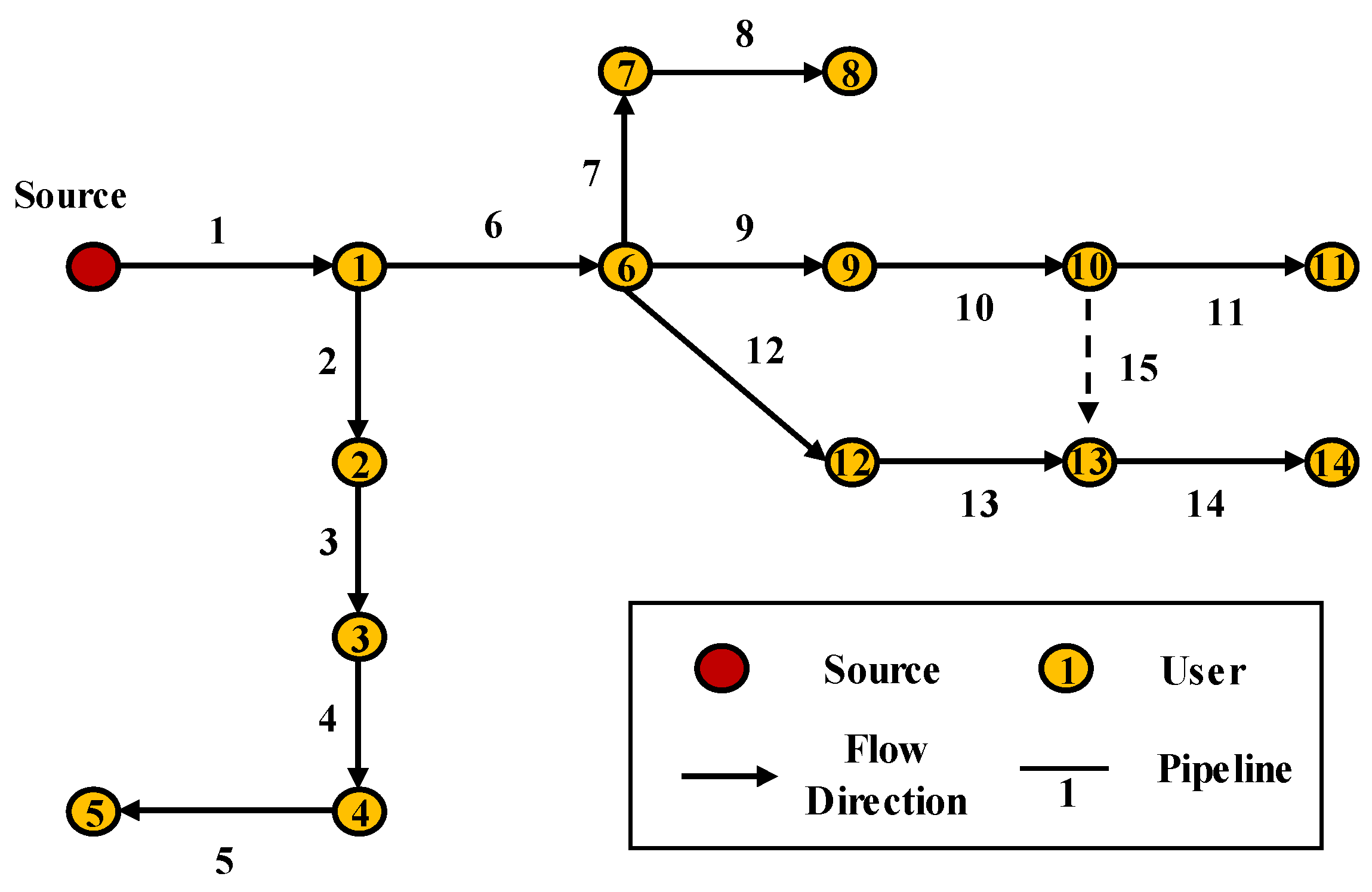 - Scenario B: Total demand of all users is 3569.0 × 104 m3/d. This scenario represents a ‘synthetic extreme’ condition determined by the 3-sigma rule (μ + 3 σ) It serves as the statistical upper boundary of probable demand, designed to stress-test the network’s supply assurance limit under rare, severe load surges.