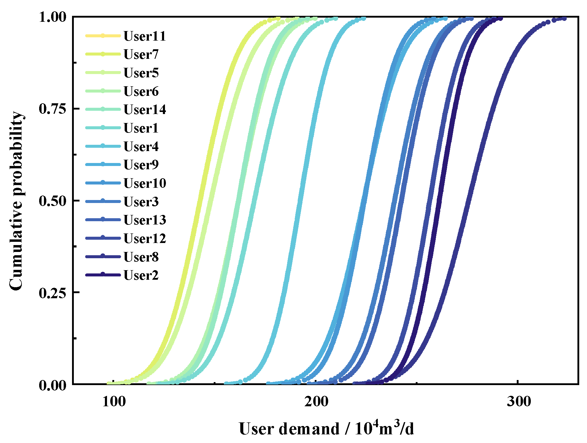 - Scenario A: Total demand of all users is 3049.1 × 104 m3/d. This scenario represents a ‘typical high-load’ condition (approximately μ + 0.5 σ), derived from the forecasted CDF to simulate common seasonal fluctuations where demand rises moderately above the baseline.