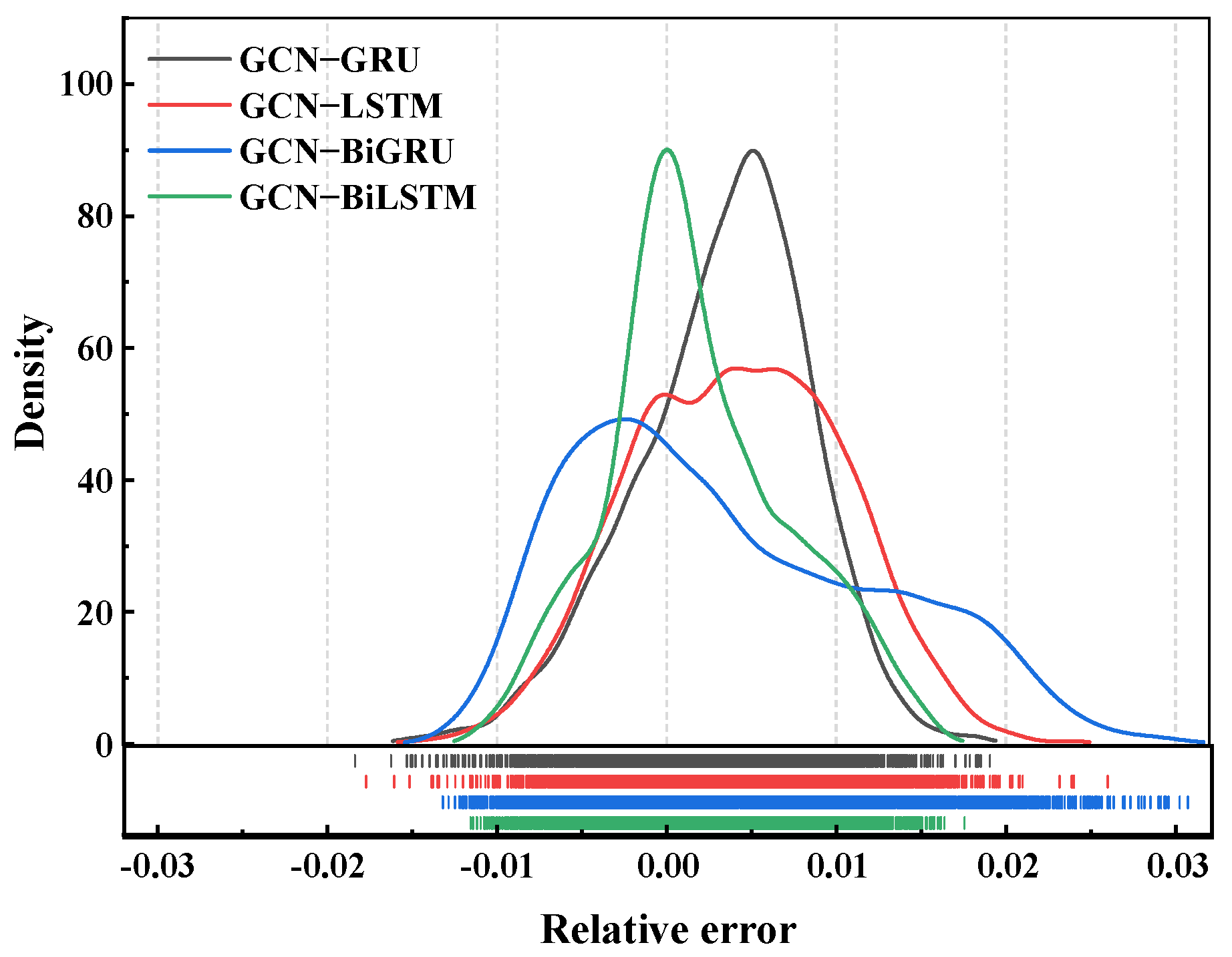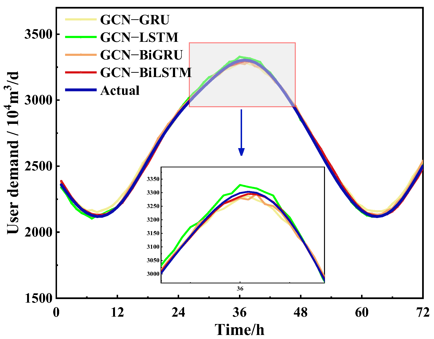 - Forecasting performance is assessed against three baseline sequence models, including GRU, LSTM, and BiGRU. Their prediction results are compared with those of the proposed model. A unified set of metrics is used to quantify prediction accuracy. To control experimental conditions, all models use the ReLU activation function. To ensure a fair comparison, a unified training protocol was adopted. The Adam optimizer was used with an initial learning rate of 0.0005. The maximum number of training epochs was set to 200, coupled with an Early Stopping mechanism (patience = 20) monitoring the validation loss. The hyperparameters were tuned via grid search on the validation set. The evaluation metrics are as follows: