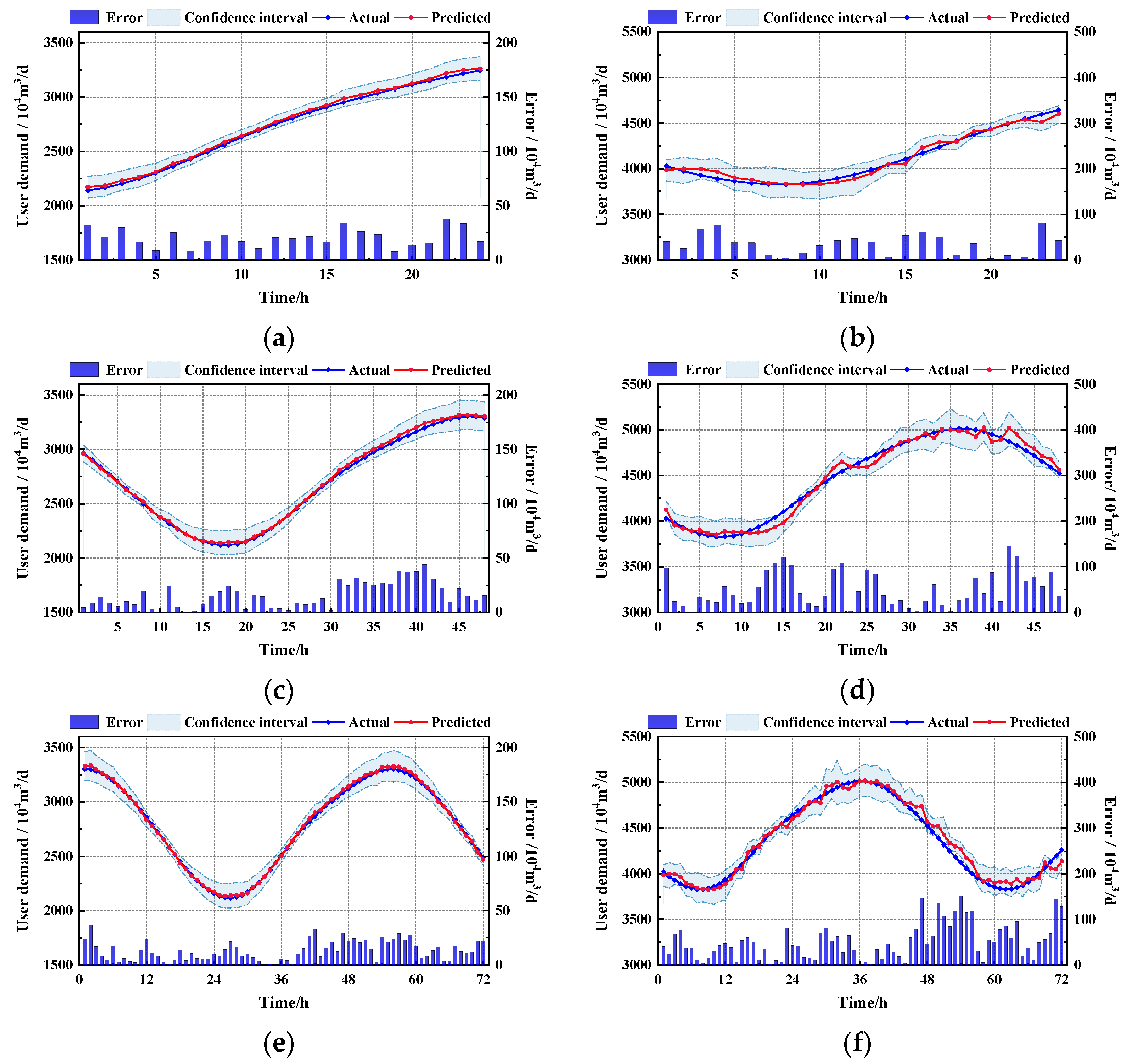 where n is the number of prediction samples, yi is the true value for sample i, is the predicted value for sample i, is the mean value for yi. - Forecast horizon strongly affects prediction accuracy. The applicability and stability of the proposed method are tested under three horizons: 24 h, 48 h, and 72 h. Model performance is compared across these time scales.