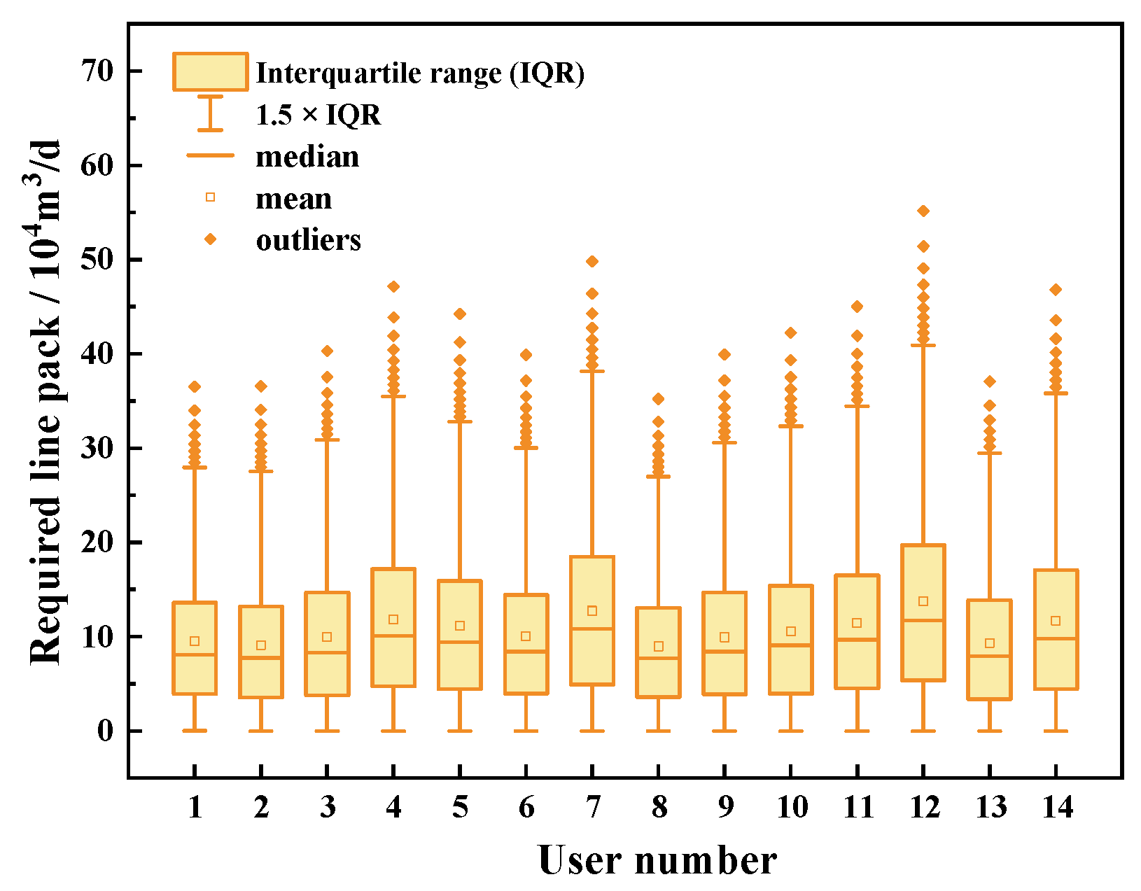 - Scenario analysis reveals the critical role and limitations of line pack. Under normal stochastic fluctuations, line pack acts as an effective short-term buffer, maintaining high user satisfaction. However, under extreme scenarios, the analysis identifies clear “capability boundaries” where line pack alone is insufficient, particularly for structurally disadvantaged end-users. These findings suggest a hierarchical scheduling strategy: utilizing line pack for high-frequency, low-amplitude fluctuations, while reserving external resources for low-frequency, high-impact events.