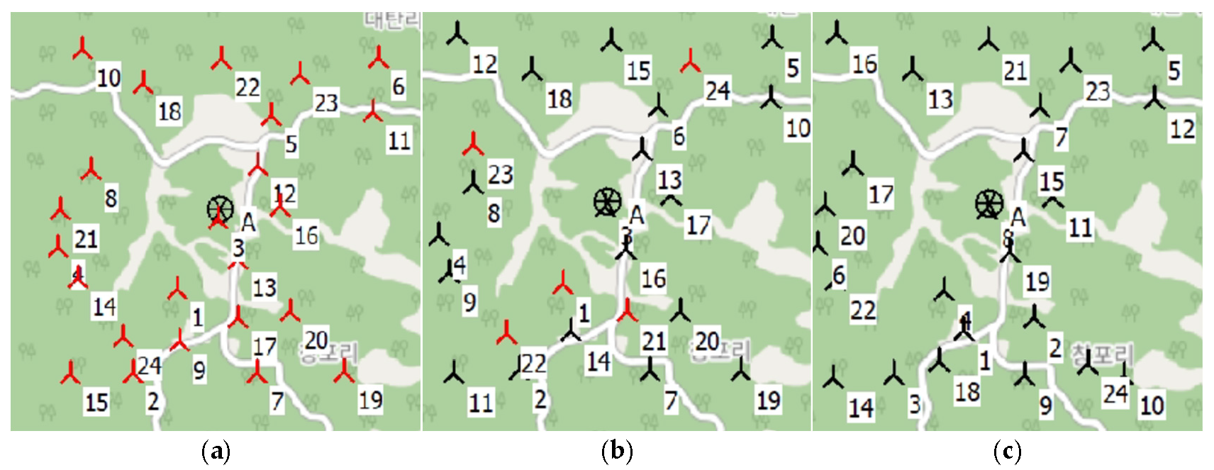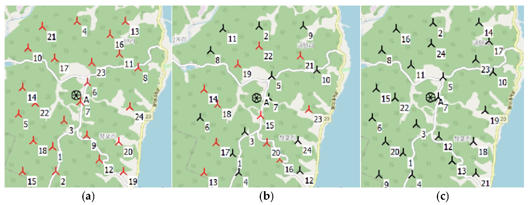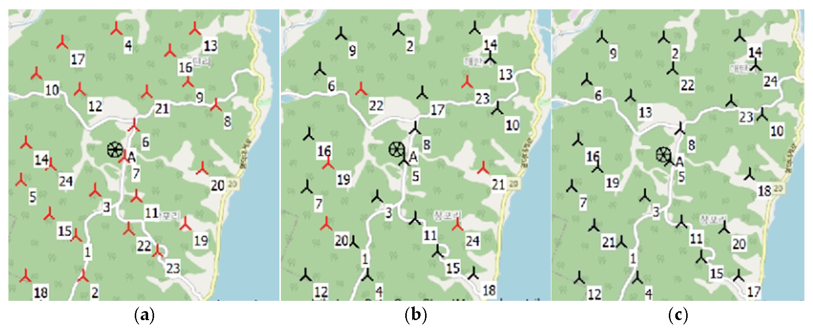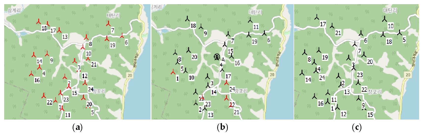 13] conducted a pioneering study that optimized the positions of wind turbines using the GA and Jensen models. Since then, several studies have reported performance improvements by optimization with GA to decrease the levelized cost of electricity (LCOE) or increase the amount of power generated by wind farms [