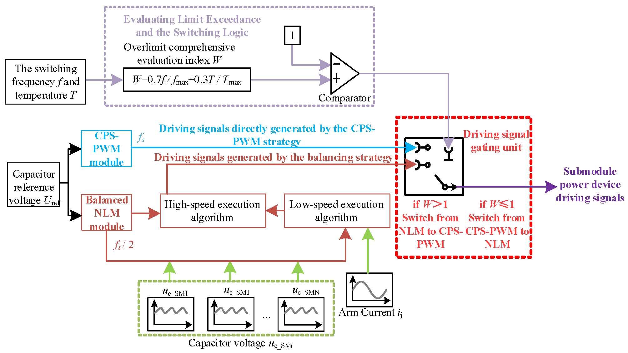 - Threshold Monitoring and Switching Logic: The system continuously computes the comprehensive evaluation metric W for each submodule in real time. Upon detecting W > 1, the system determines that this sub-module is in an abnormal stress condition (due to excessive switching frequency or high temperature). The controller immediately initiates a handover, shifting the submodule’s modulation source to the CPS-PWM scheme. To prevent chattering, the system reverts to the NLM-based strategy only after W returns to the normal range (W ≤ 1) and remains stable for a predefined hysteresis period. The hysteresis cycle is set to 10 fundamental wave cycles, corresponding to a 50 Hz system, which is approximately 0.2 s. This real-time decision-making is implemented via digital comparators, obviating the need for complex computational overhead.