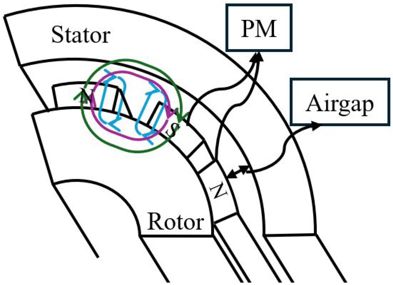 Figure 1. As shown in the figure, the magnetic flux can be classified into three distinct components. The first component, indicated by the blue path, represents the flux circulating within the PM and the rotor core. The second component, shown by the purple path, corresponds to the leakage flux that flows directly between adjacent magnets through the rotor core. The third component, depicted by the green path, represents the effective air-gap flux, which crosses the air gap and links the stator core, rotor core, and PMs [