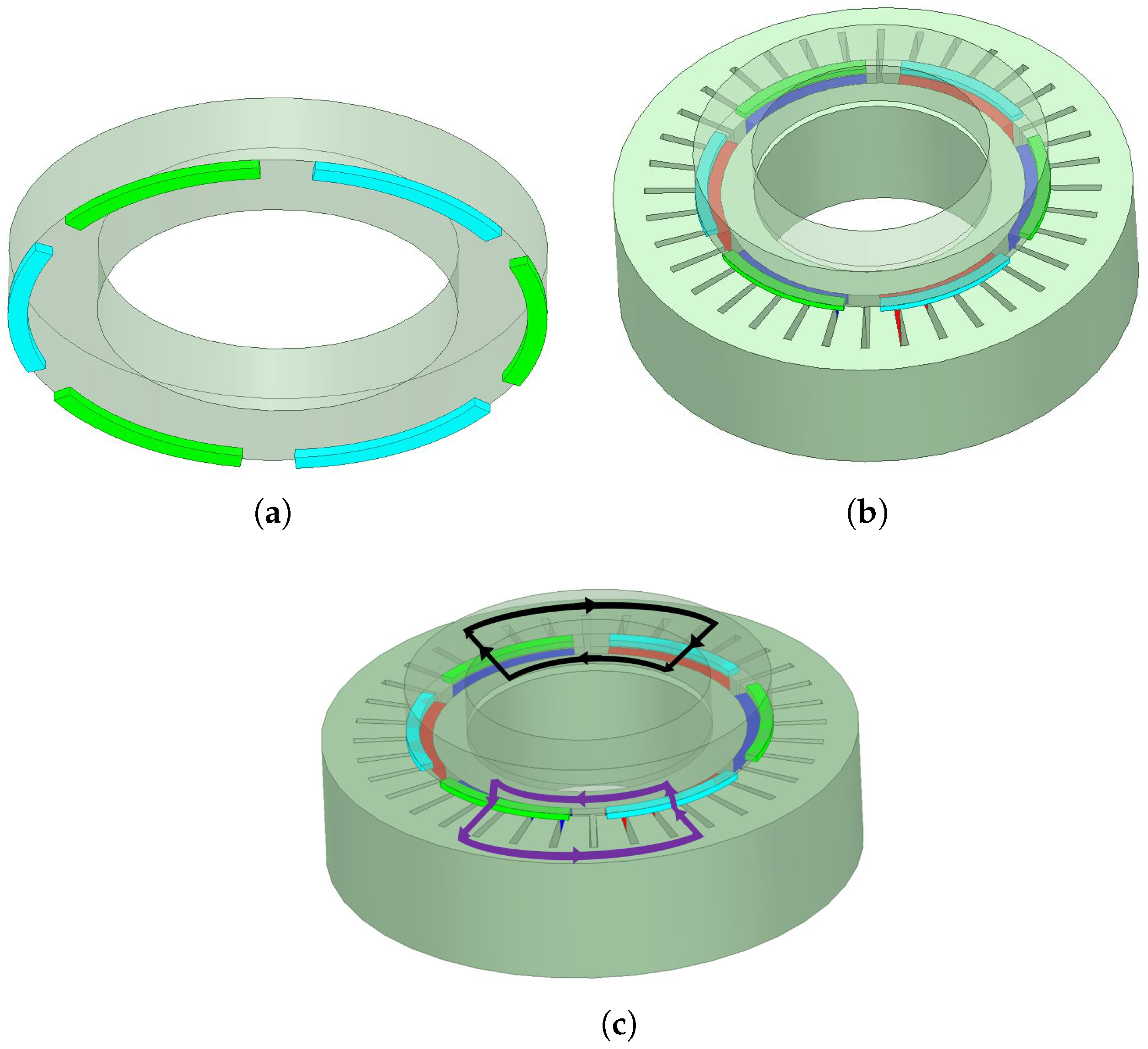 PMSM machine: (a) axial rotor; (b) whole configuration; (c) magnetic flux.