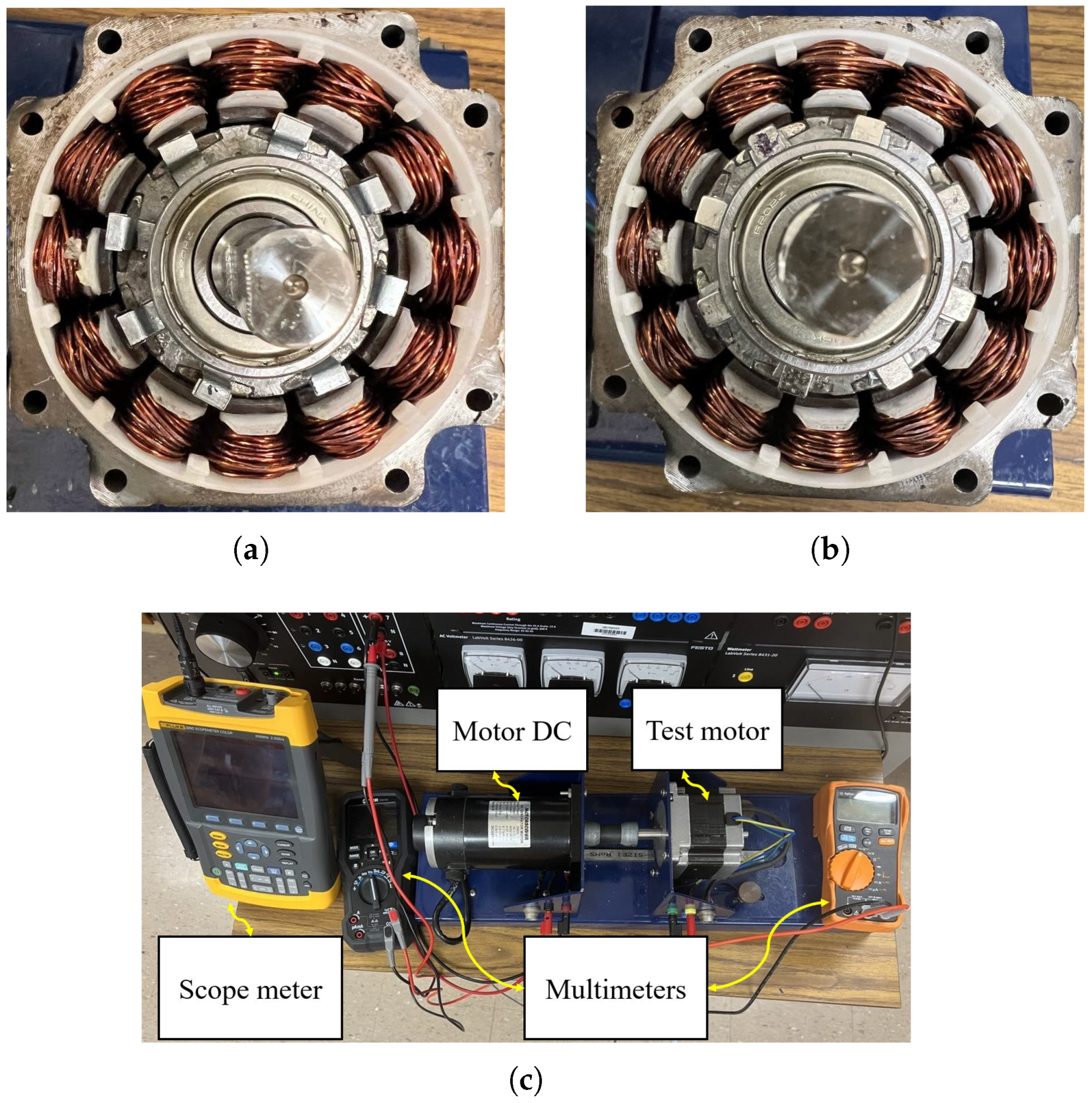Figure 6c. A Fluke 225C ScopeMeter (Fluke Corporation, Everett, WA, USA) with an optical communication port operating at a baud rate of 38,400 was used for voltage waveform acquisition. In addition, voltage measurements were verified using Agilent U1232A (Agilent Technologies, Santa Clara, CA, USA) and FLIR DM286 digital multimeters (FLIR Systems, Wilsonville, OR, USA). The motor was rigidly mounted to the test bench using M5 screws to ensure mechanical stability during testing.